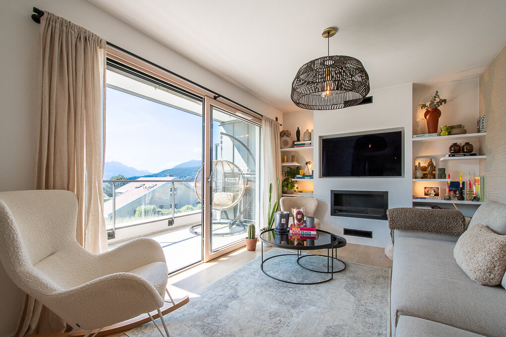 Magnificent 3-room flat with clear views of the lake and the mountains. With approx. 68.43 sqm, it comprises a bright living room with an open-plan fitted kitchen, a dining room and a lounge with fireplace. 2 bedrooms. Bathroom and separate toilet.