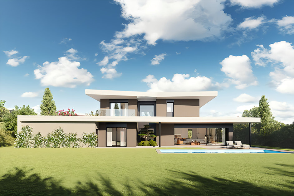 Magnificent architect-designed villa with contemporary lines and top-of-the-range features (high quality materials, home automation, etc.). Bright and highly functional, the house has a total of 255 sqm open onto the landscaped garden with swimming pool.