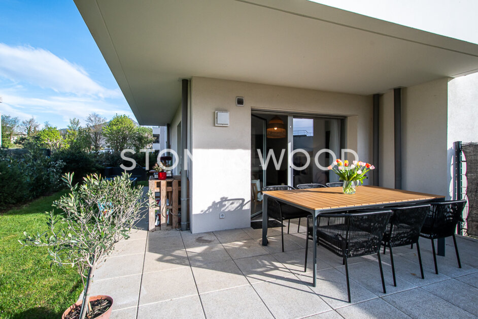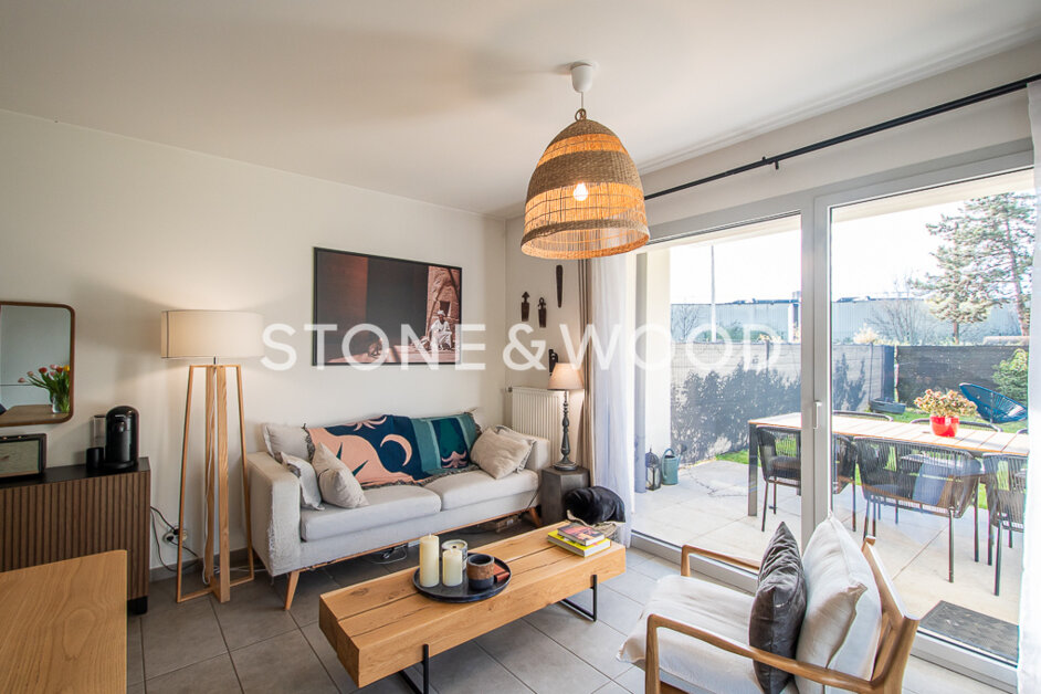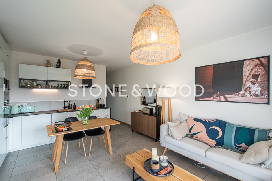 Modern 2-bedroom flat of 55 sqm with a private garden situated in a 3-storey buiding dating from 2020. It comprises a lounge/living room with an equipped kitchen opening onto the terrace/garden. Night area with 2 bedrooms, a bathroom and a separate toilet. Cellar and bike room. Visitor parking spaces.