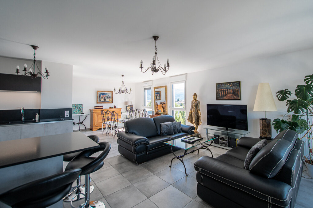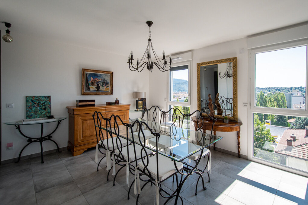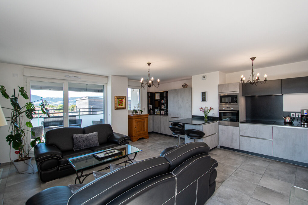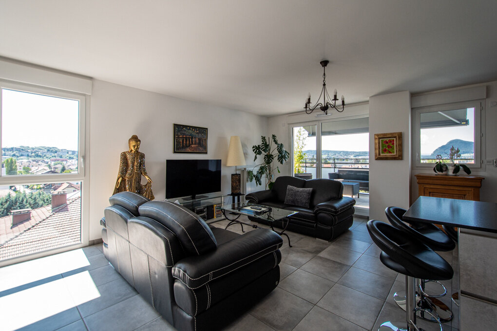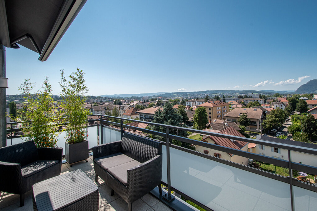 Located near the 'Place des Romains' in Annecy. Direct access to the highway.On the attic with elevator, in a recent and secure building, a large 3-rooms apartment of 80 sqm in triple orientation. Large living room with lounge and dining-room, open equipped kitchen and access to the 11 sqm terrace ideally west facing. Stunning view of all the surrounding mountains.The sleeping area consists of two bedrooms, a bathroom with double sink and a separate toilet. Storage.Closed condominium parking. Bicycle storage room.Close to commodities: supermarket, local shops, buses, schools, sports facilities.DPE: C - Co-ownership of 35 lots - No procedure in progress - Annual charges: 1300 €Fees including tax at the seller's expense