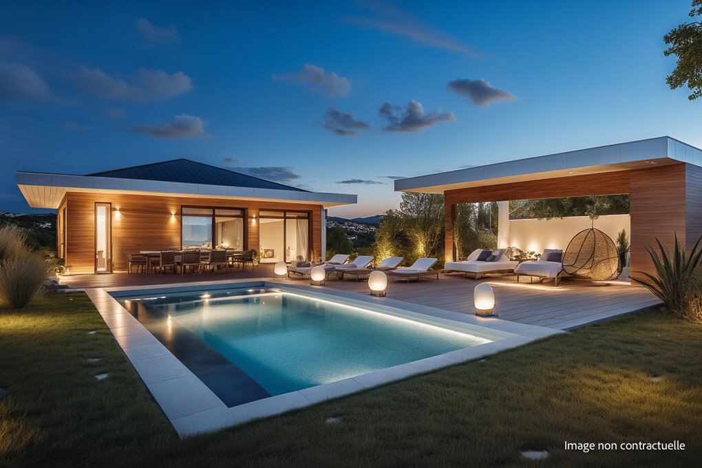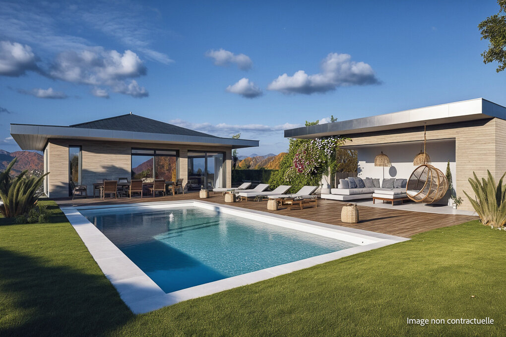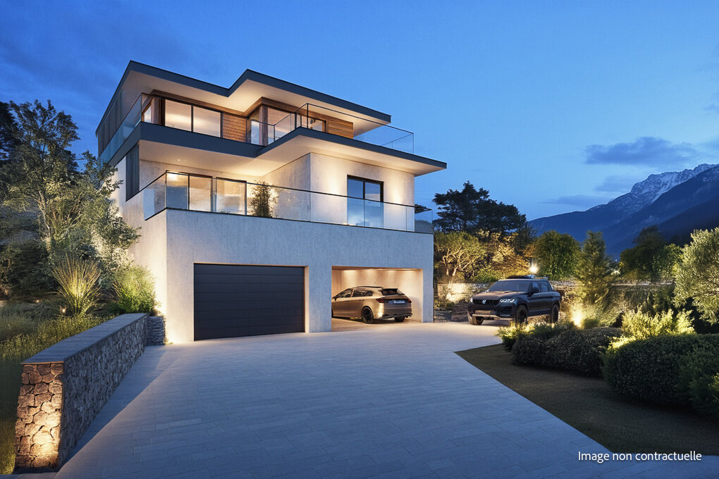 This project includes high-quality fixtures and fittings: oak parquet flooring, porcelain stoneware, aluminium joinery, adjustable sun blinds and roller shutters in the bedrooms, heat pump, heated swimming pool (4 x 8 m) with underwater curtain, motorised garage doors, glazed railings, tarmac courtyard, etc. It can be completely remodelled to suit your requirements.