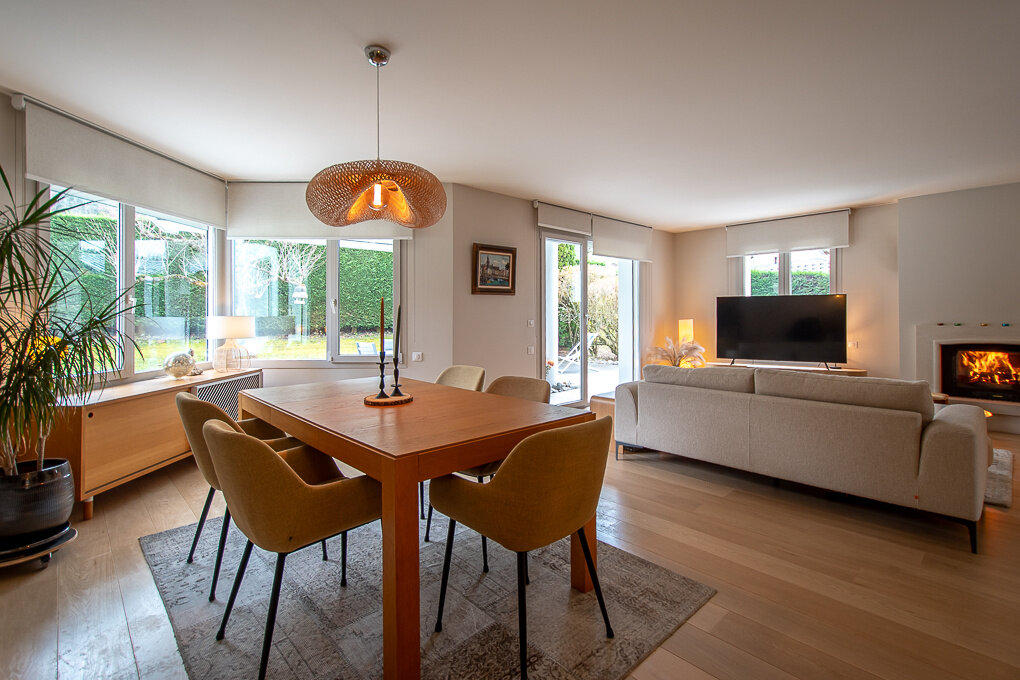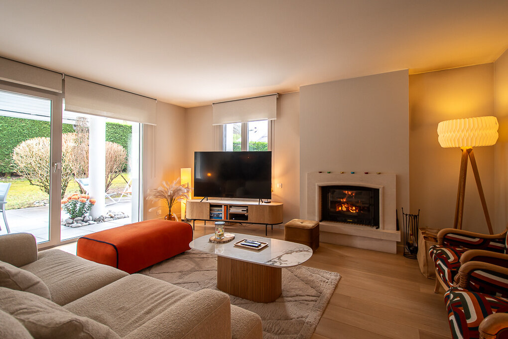 Inside, natural light flows throughout the home, enhancing the generous volumes, carefully selected materials and the gentle ambience where every window frames a picture-perfect view. The property opens onto a double height entrance hall leading to a spacious living room with a fireplace and direct access to the garden. The semi-open, fully equipped kitchen includes a dining area. A master suite with a dressing room and en-suite bathroom/shower completes this level.