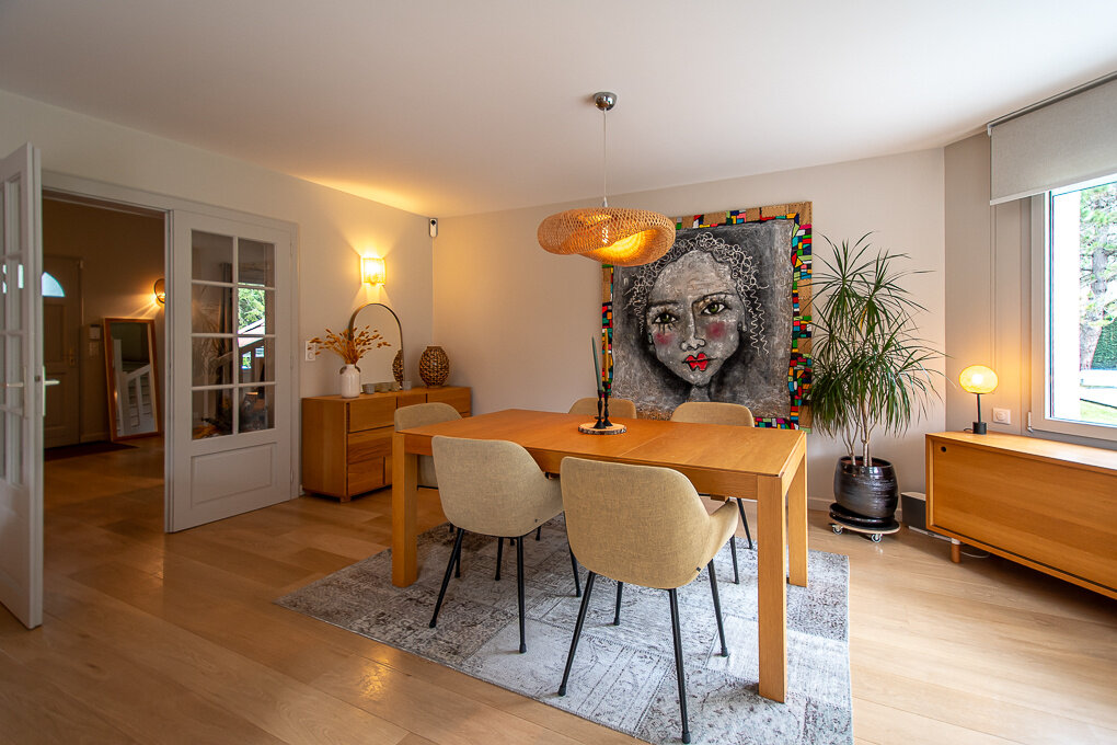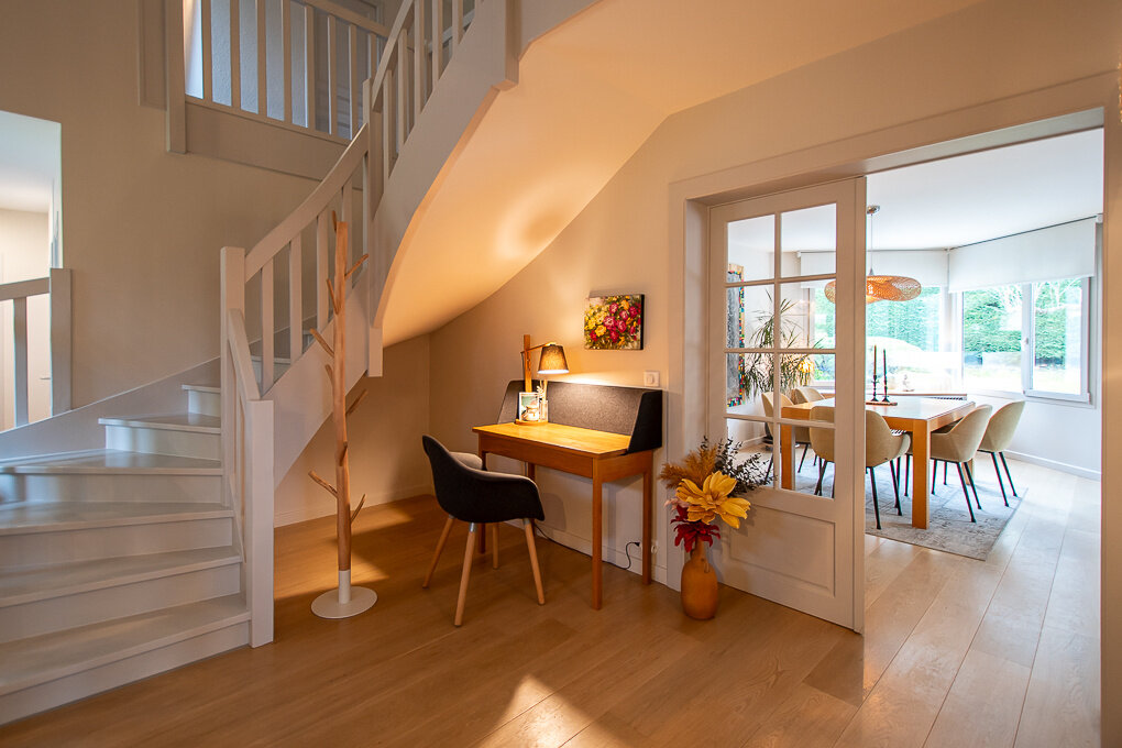 Inside, natural light flows throughout the home, enhancing the generous volumes, carefully selected materials and the gentle ambience where every window frames a picture-perfect view. The property opens onto a double height entrance hall leading to a spacious living room with a fireplace and direct access to the garden. The semi-open, fully equipped kitchen includes a dining area. A master suite with a dressing room and en-suite bathroom/shower completes this level.