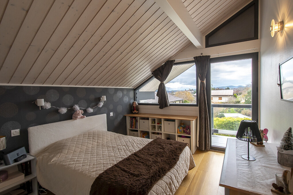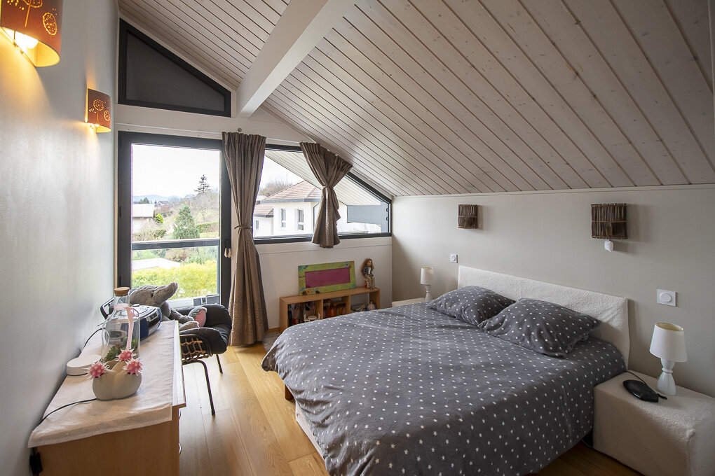 Poisy In a sought-after area, just 15 minutes from Annecy and 30 minutes from Geneva, this contemporary villa built in 2014 offers a rare living environment, combining tranquility, brightness, and high-quality amenities. Nestled at the end of a cul-de-sac, on 705 m2 of landscaped grounds, fully enclosed and secured by a motorized gate, it enjoys optimal sunshine and a particularly pleasant environment.