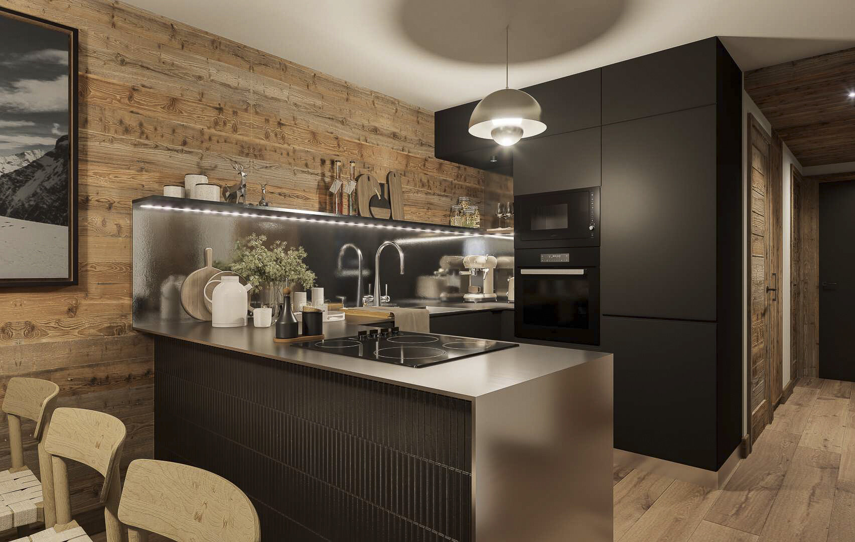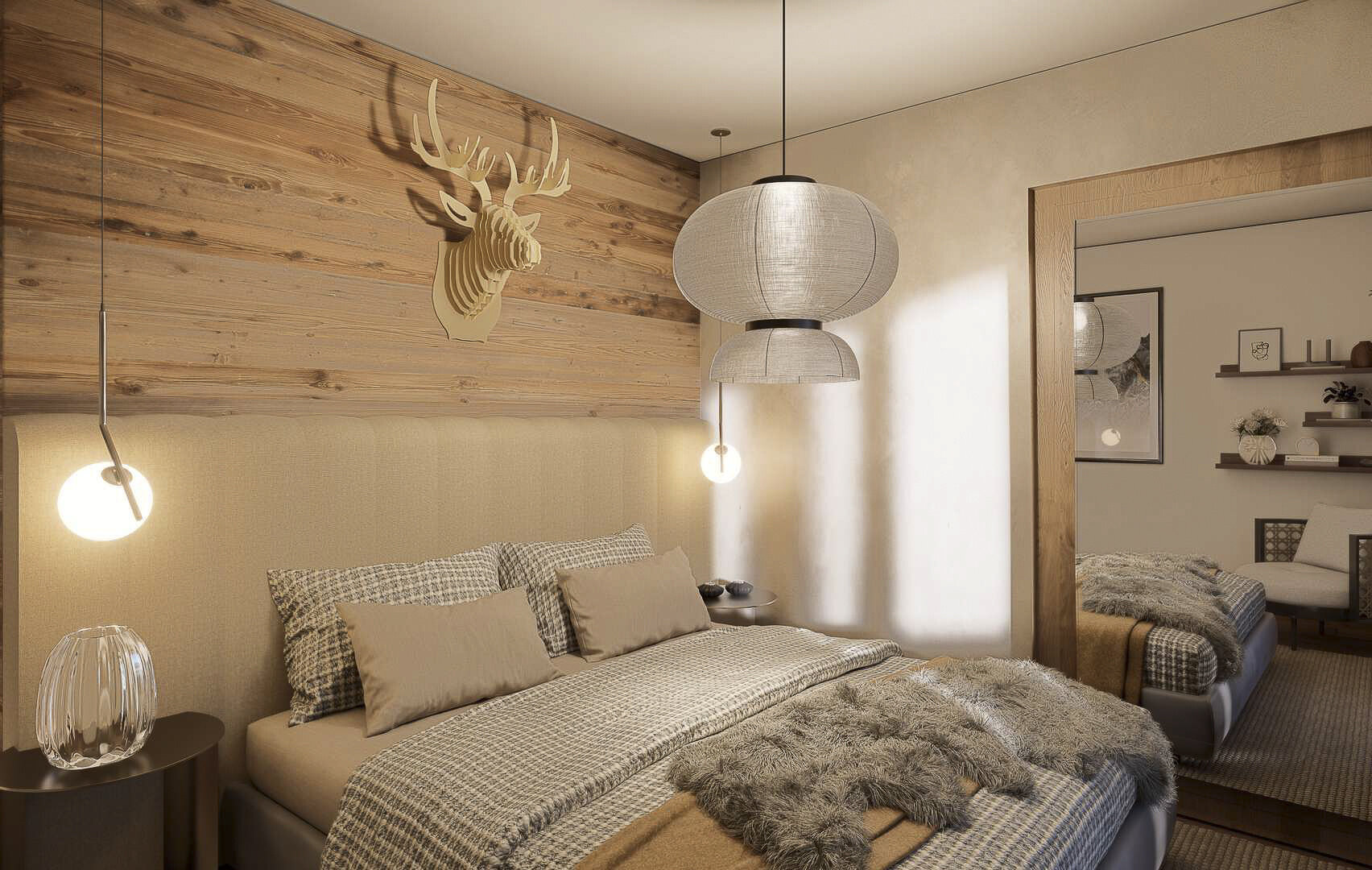Located in an intimate and secure residence comprising 11 units spread across 4 chalets, the apartment features a warm and inviting living area extended by a terrace, a bedroom with built-in wardrobes, a bunk room also fitted with storage, and a utility room / ski room. The high-quality finishes and materials are in harmony with the mountain style, including oak parquet flooring, underfloor heating, and meticulous detailing.