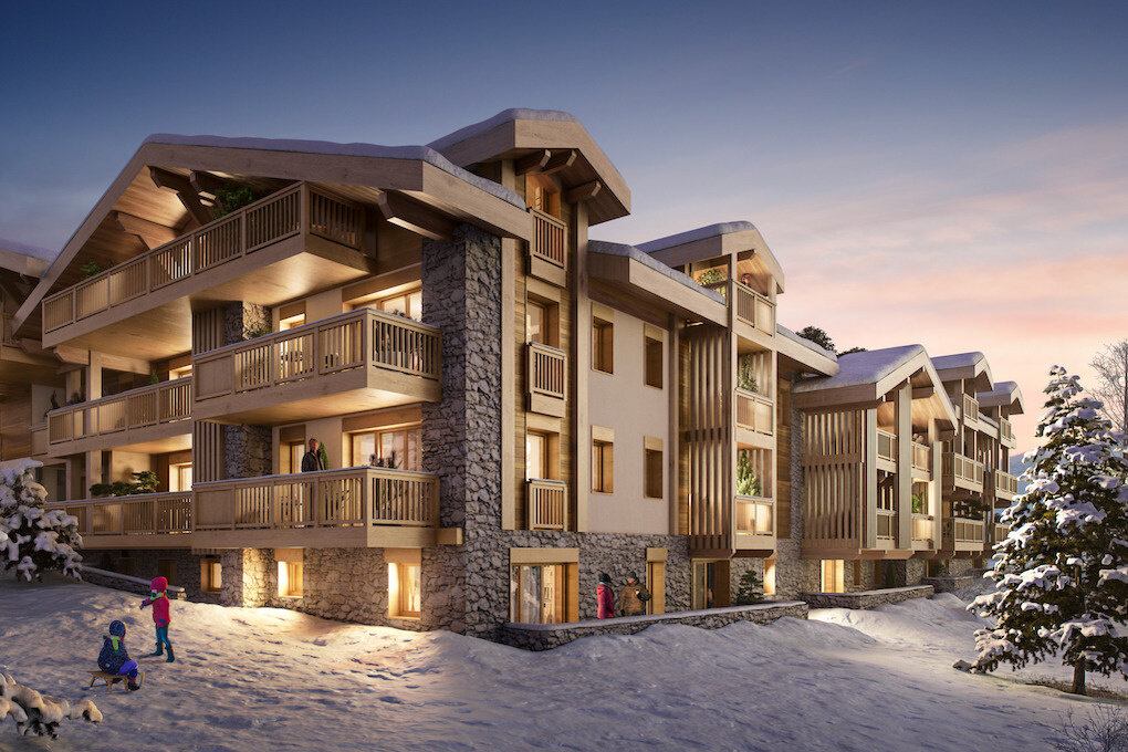 In the charming village resort of Les Gets, a stone and wood residence featuring 26 apartments with architecture inspired by traditional Haute-Savoie alpine farms.