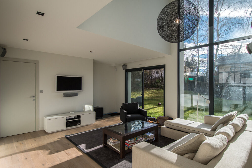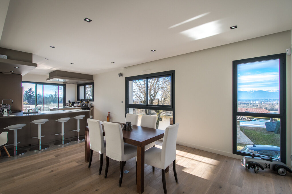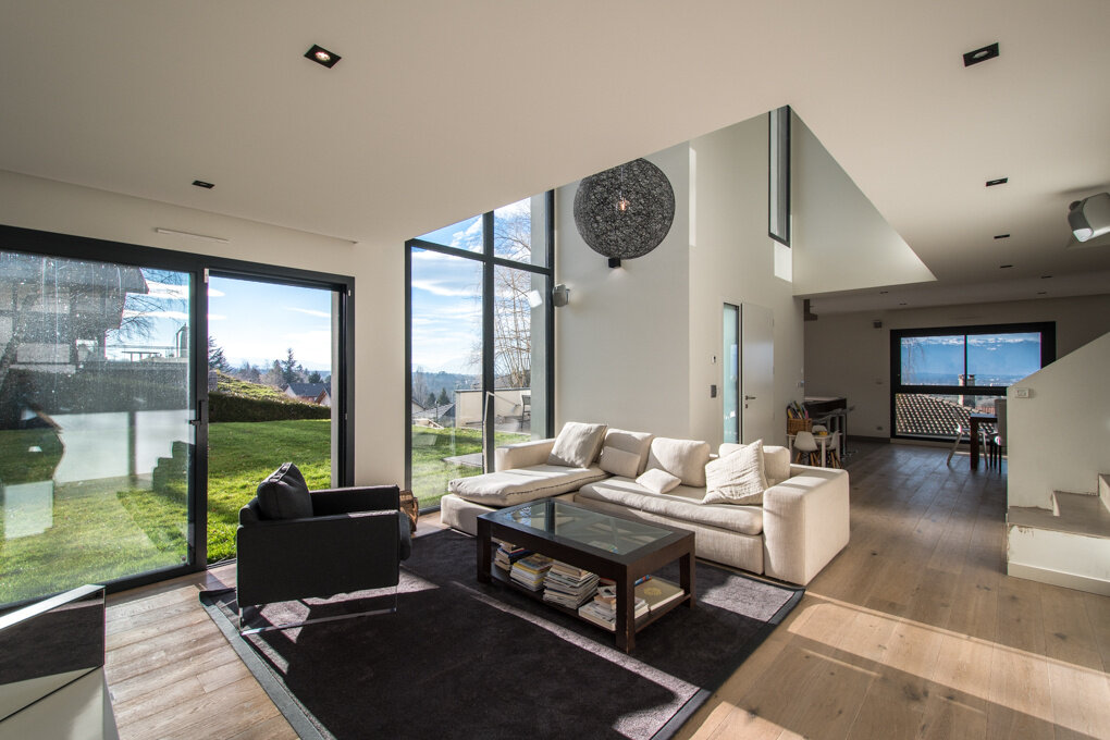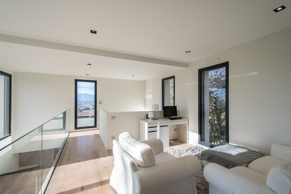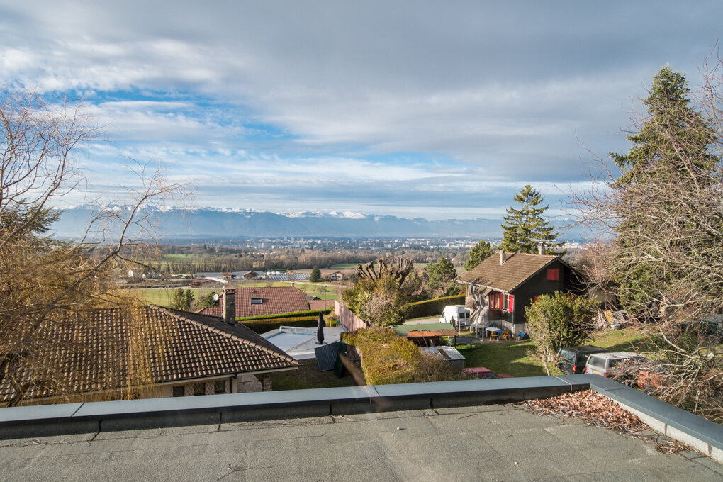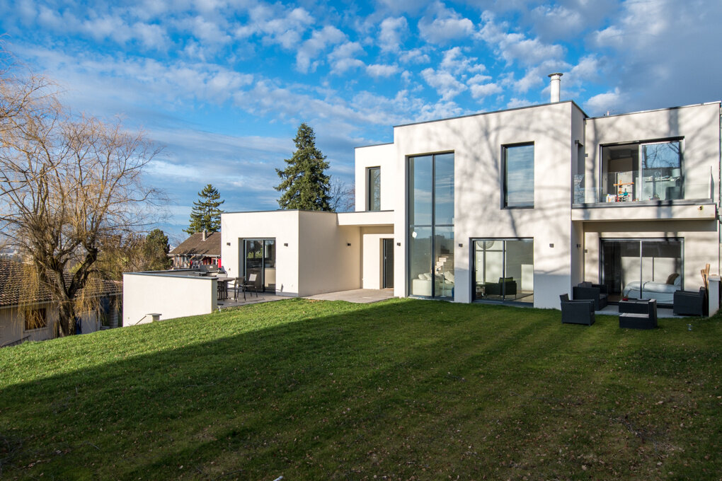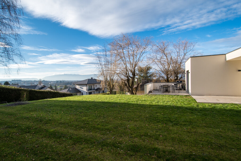Sublime contemporary house of about 240 sqm with possibility of enlargement, established on a plot of 1'027 sqm. Villa of architect, bright with nice volumes having a large living room with several access terrace. Fully equipped kitchen open to dining-room. 3 bedrooms and possibility of 4 including a master suite. Studio to renovate. Full basement. Large garage and parking. Stunning view on Geneva and the Lake. DPE : B