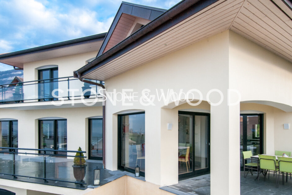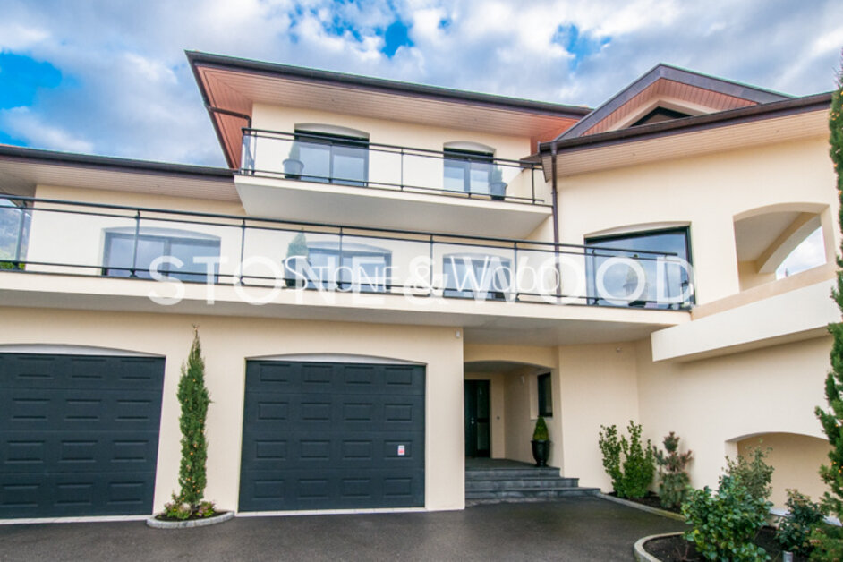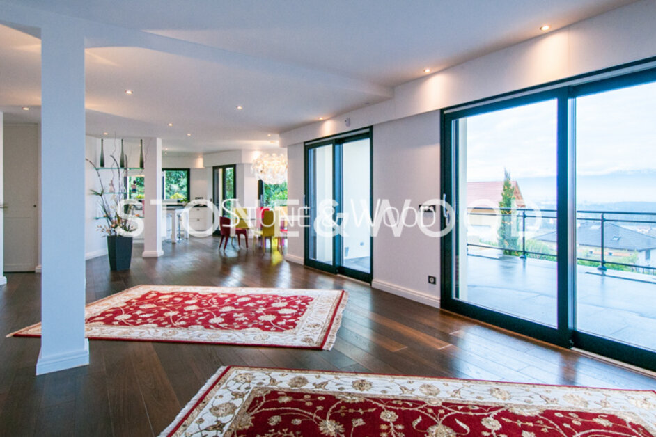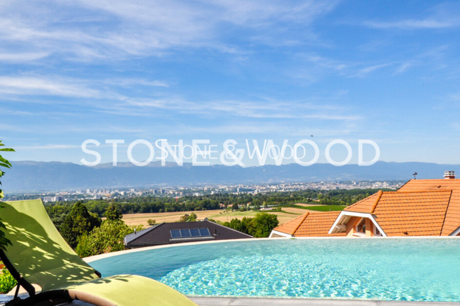 Sublime contemporary house about 280 m2 built recently with high quality materials. Property with spacious and bright set on a plot of 926 m2 closed and trees. Fitness room. Wine cellar. Laundry. Large garage for 4 cars. Heated pool. Stunning view of Geneva. DPE: C