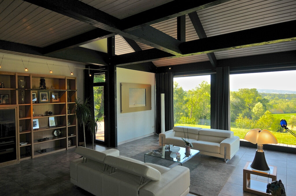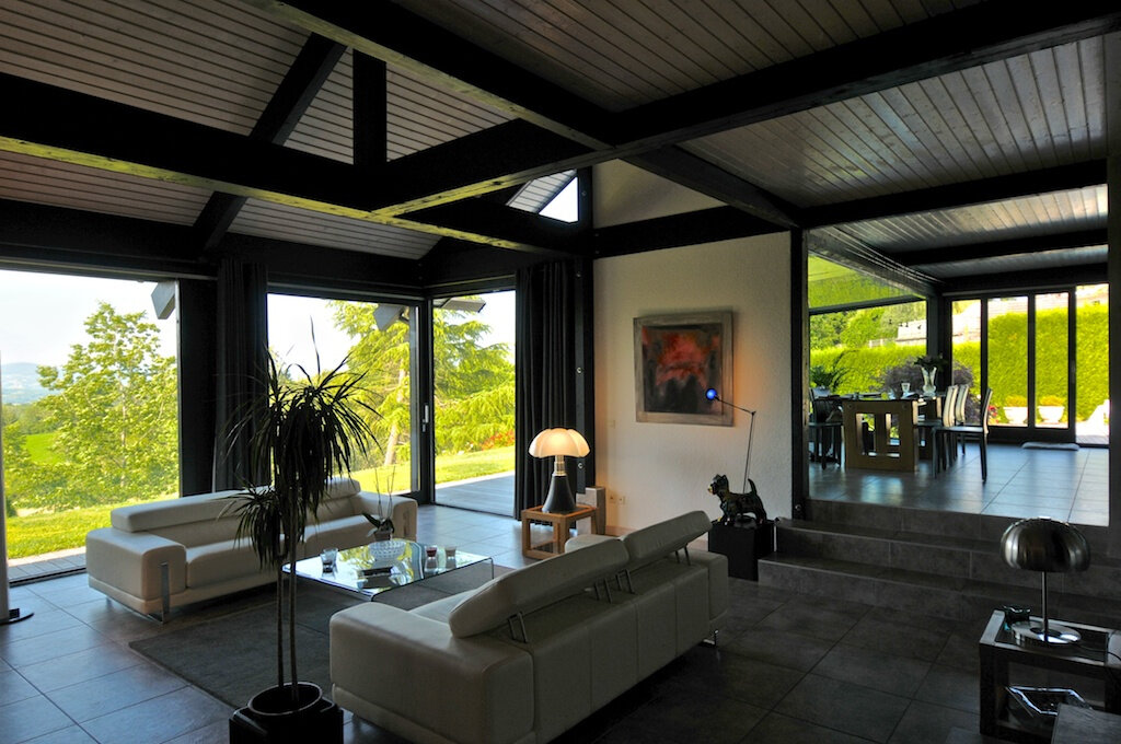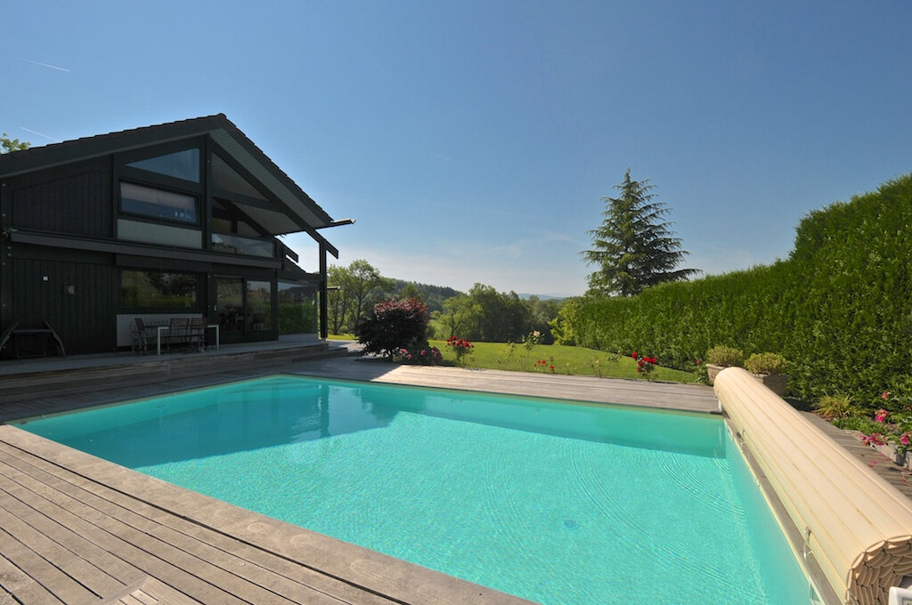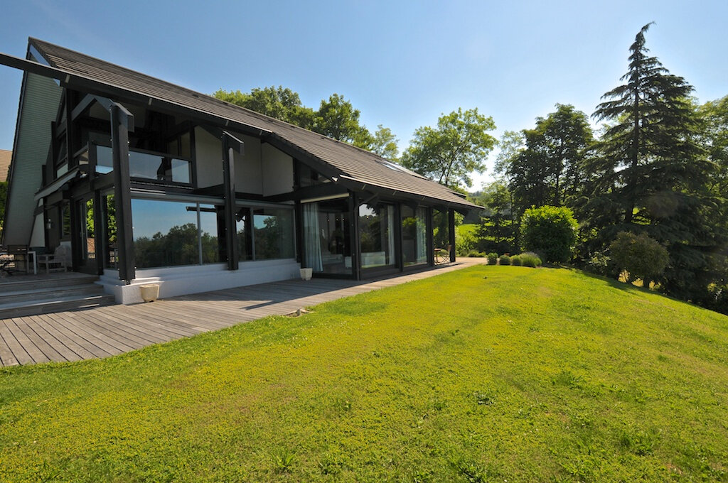 Magnificent contemporary property of 230 m2 living space. Plot of 5,400 m2 with trees, beautiful bright living space, fitted kitchen open to the dining room with several terrace accesses, 2nd living room, 5 bedrooms including a master suite, 3 bathrooms. Large basement with 20 m2 wine cellar, games room, heat pump heating and hot water production by solar panels. Heated swimming pool. Impregnable and clear view. Calm, green environment and without vis-à-vis. Parking and carport