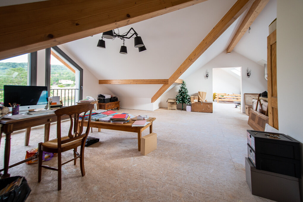 The main 235 m2 triplex includes a spacious living area that opens onto a large terrace with unobstructed views of the surrounding countryside. It features an open, equipped kitchen, a lounge with a wood stove, and a dining area. There are 2 en-suite bedrooms, including a master with a dressing room. The upper floor remains to be developed, with potential for 2 additional bedrooms and a bathroom.