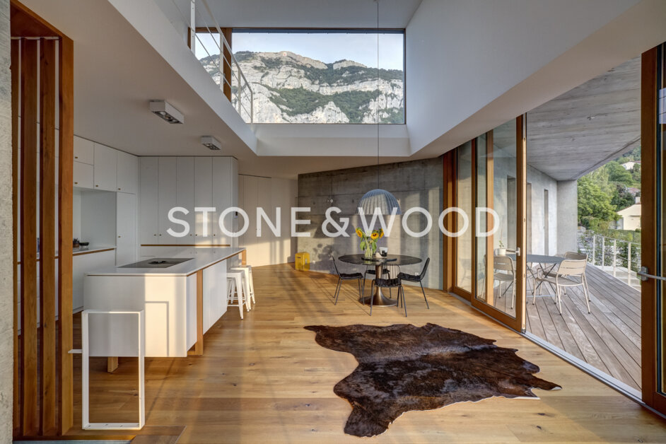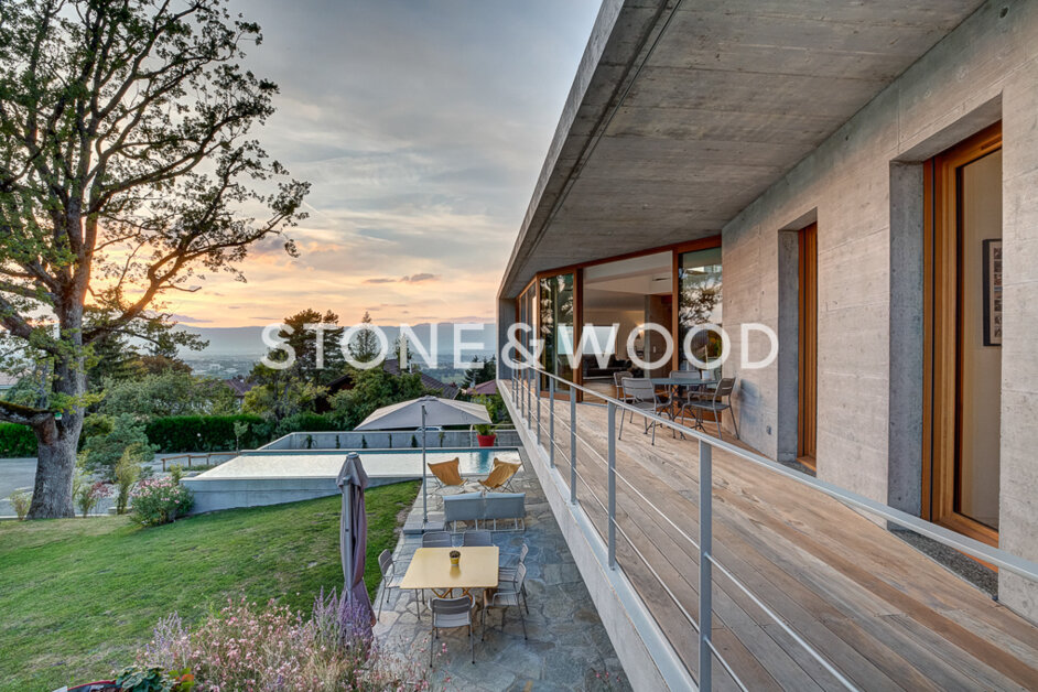 The volumes are filled with natural light and offer beautiful views over Geneva and the Jura through the large bay windows extended by terraces overlooking the garden and the heated infinity pool.