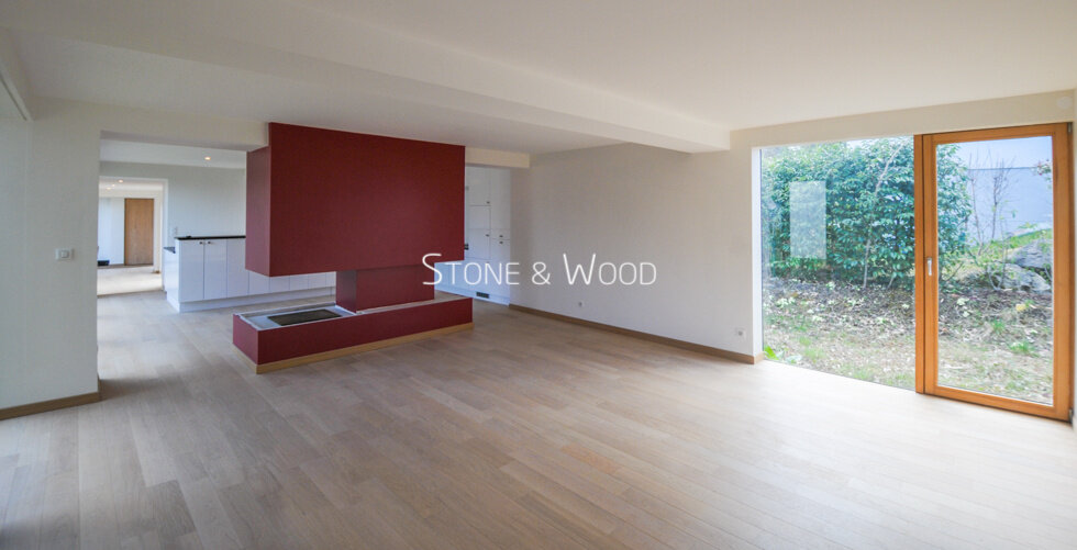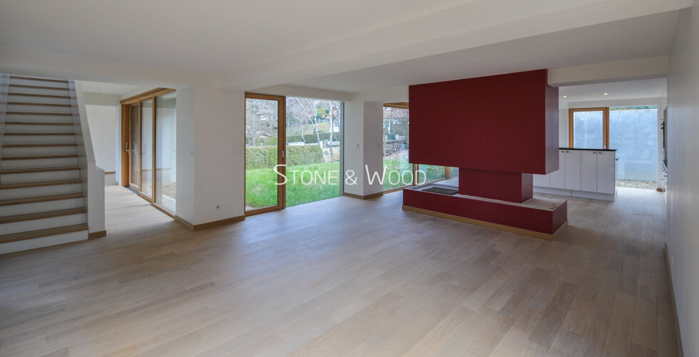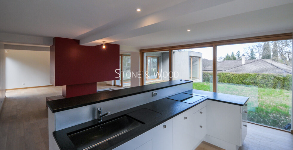 Contemporary and minimalist, beautiful house of architect of 265 sqm. Large living room with open kitchen and central fireplace. 2nd room with view on Geneva. Office, 5 bedrooms including a master suite. Double garage. Cave. Plot of 1295 sq m. Residential and quiet neighborhood close to the Golf and 10 minutes from Geneva. DPE: NC