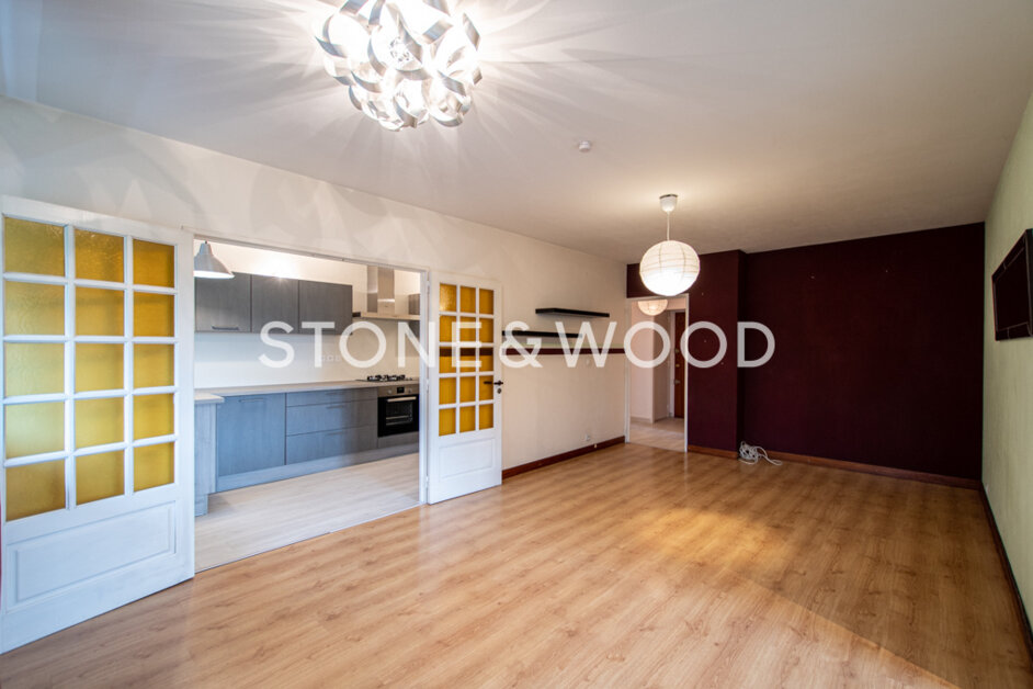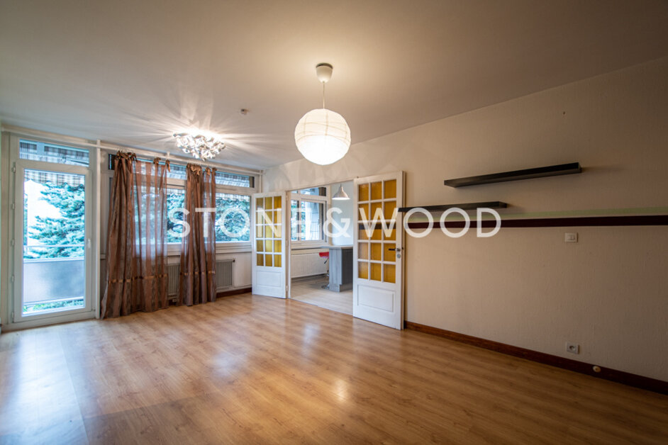 In a building dating from the 1970s located in a residential area, apartment of 89,90 sqm on the second floor out of 4, without elevator. Entrance hall with storage cupboards and pantry. Fully equipped kitchen which can be closed or opened onto the living room thanks to its two doors. Large living room with access to the south-facing balcony, without vis-à-vis. Bedroom or office. Separate sleeping area comprising 2 bedrooms, one with a dressing area. Bathroom with a large corner bath. Separate toilet.