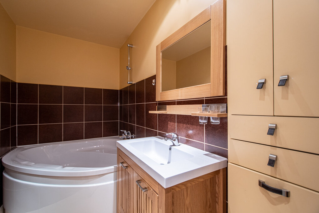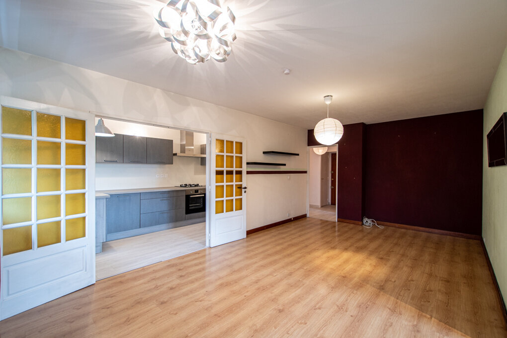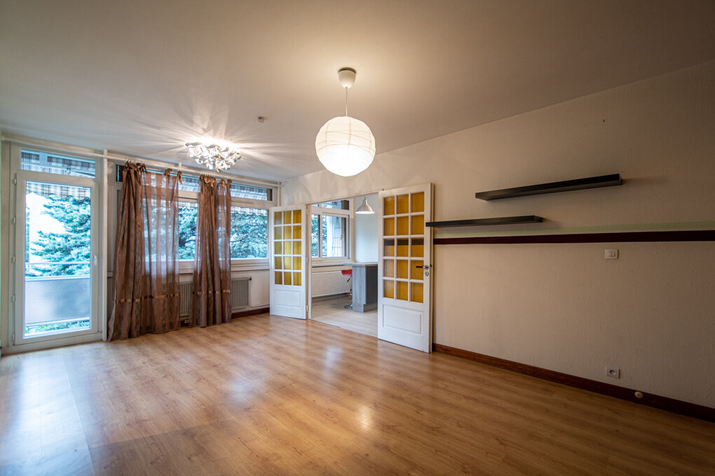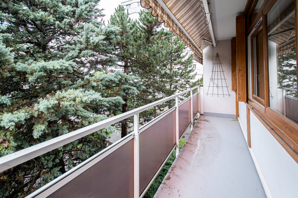 In a building dating from the 1970s located in a residential area, apartment of 89,90 sqm on the second floor out of 4, without elevator. Entrance hall with storage cupboards and pantry. Fully equipped kitchen which can be closed or opened onto the living room thanks to its two doors. Large living room with access to the south-facing balcony, without vis-à-vis. Bedroom or office. Separate sleeping area comprising 2 bedrooms, one with a dressing area. Bathroom with a large corner bath. Separate toilet.