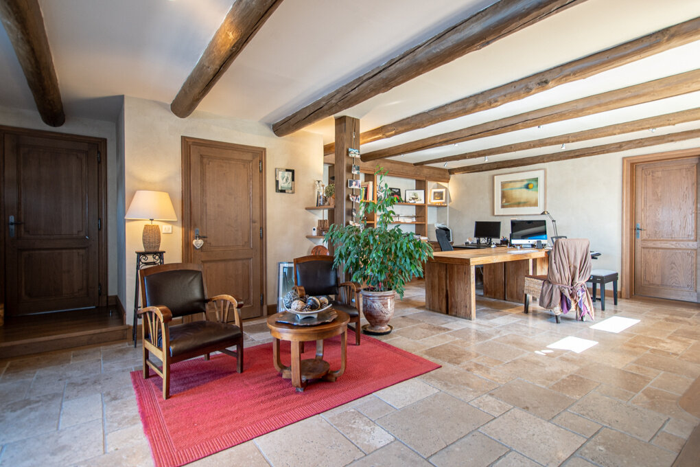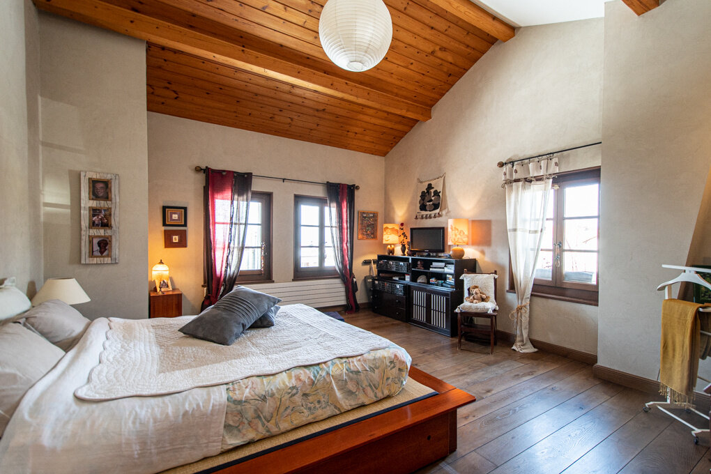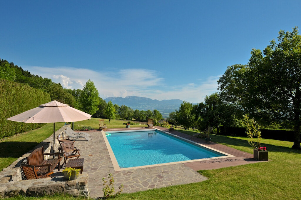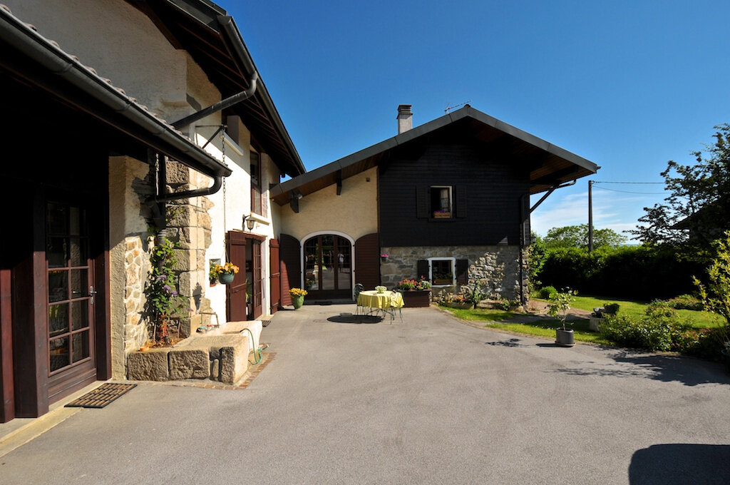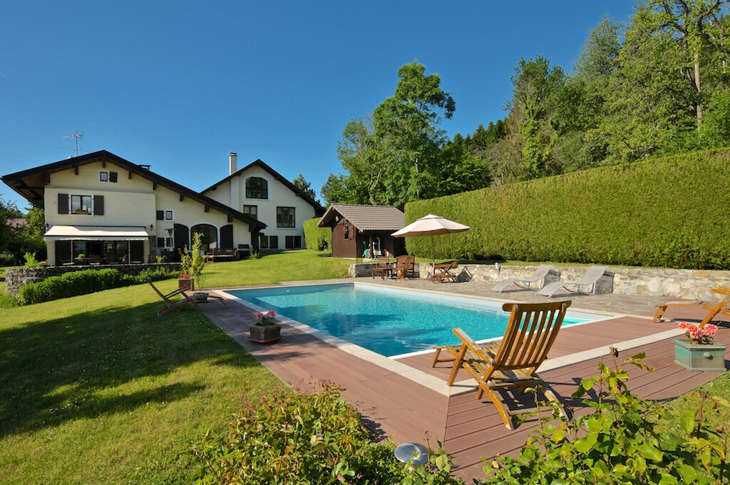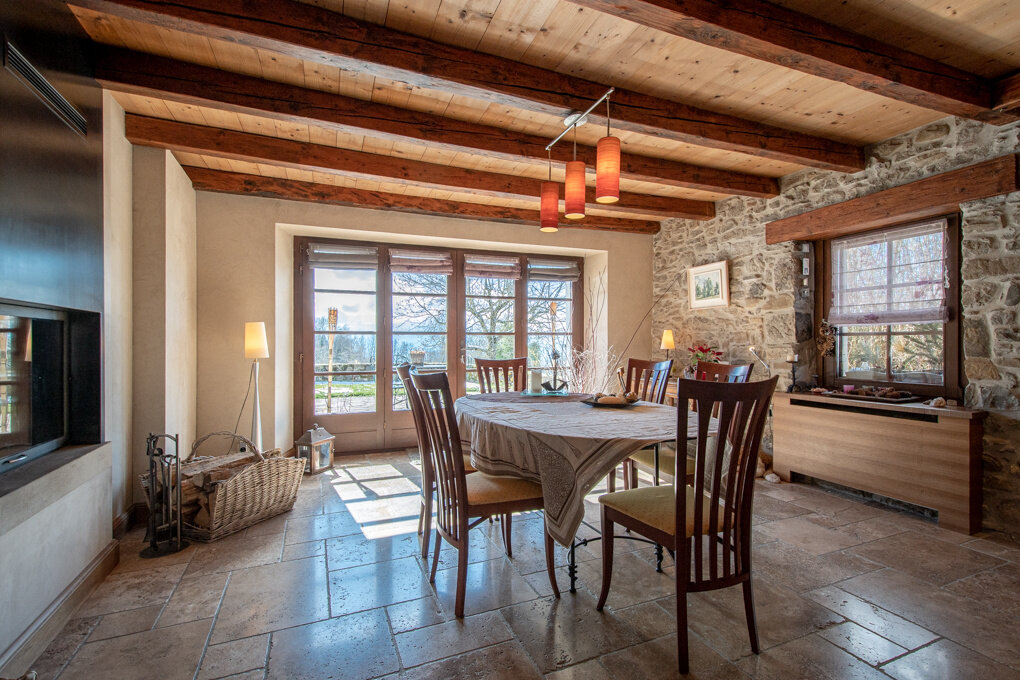 In a green environment with a panoramic view over the Genevois, magnificent renovated farmhouse of 420 sqm with high quality materials and high-end services. 7885 sqm enclosed plot planted with trees with a heated swimming pool.The property consists of a cathedral living room and a dining room with a two-side fireplace. Kitchen with bread oven. Several terrace accesses. Master bedroom with dressing room, bathroom and toilet. 3 bedrooms with ensuite bathroom or shower. Large office with fireplace. Independent studio of 41 sqm. Laundry room, pantry and wine cellar. Garages and outbuildings.Quiet and without vis-à-vis, only 15 minutes from Geneva. DPE: E