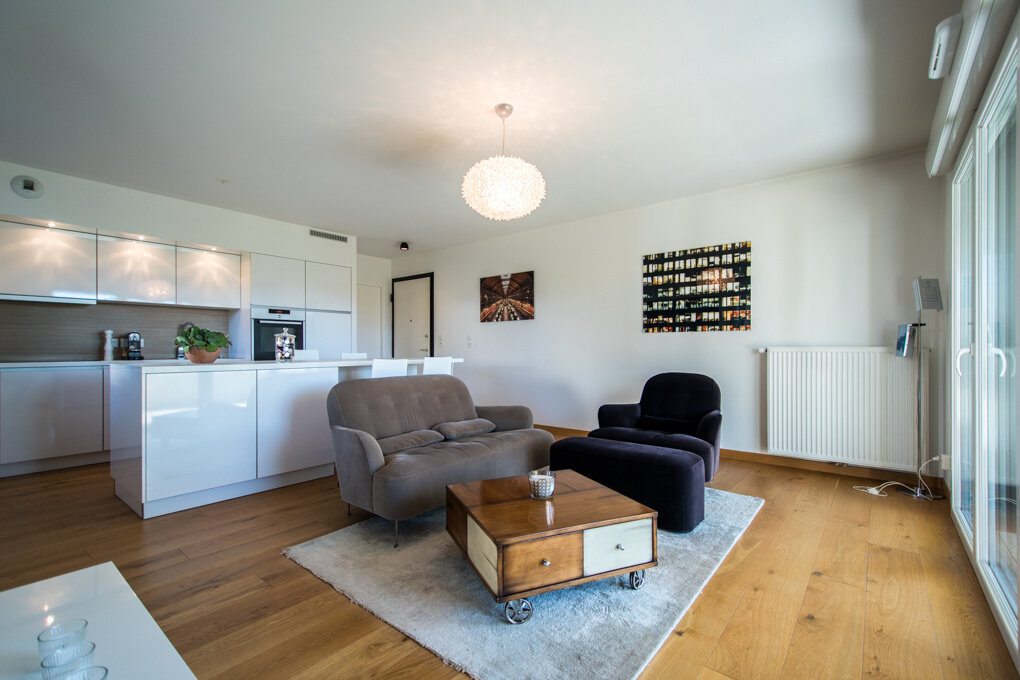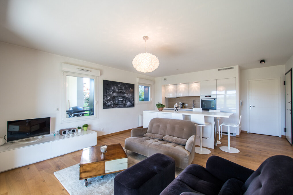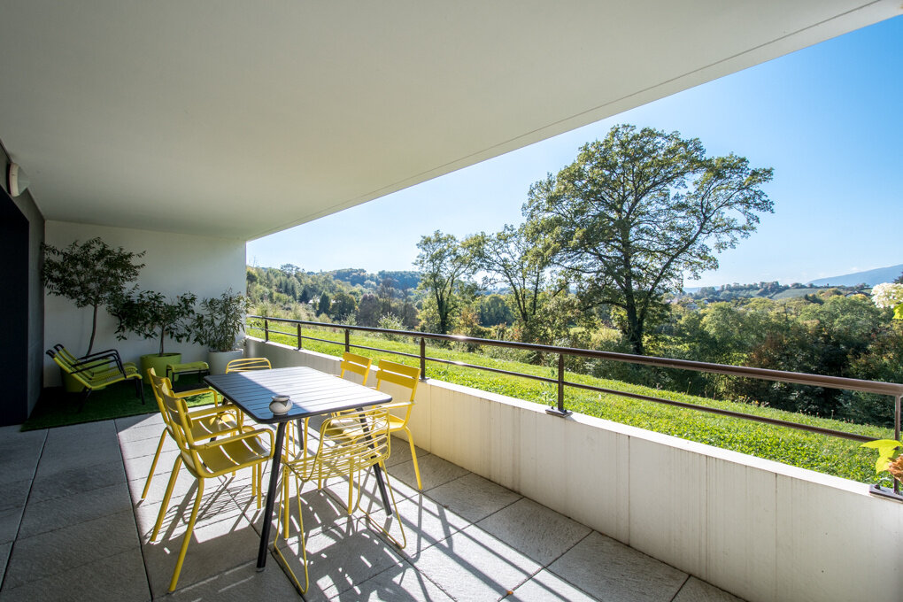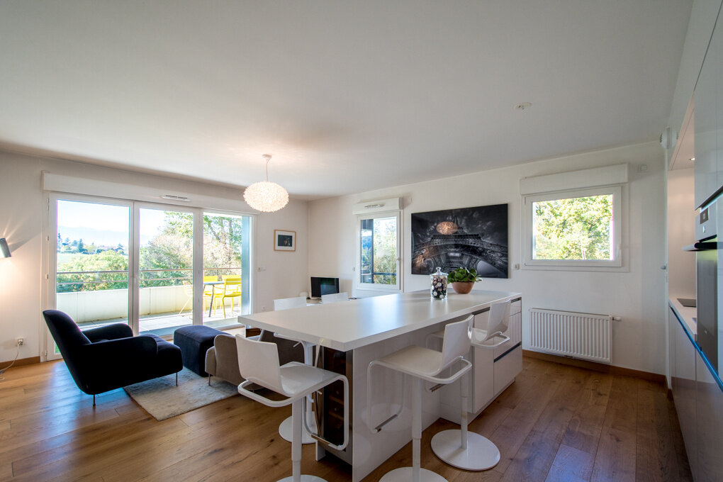 Residential environment, quiet and no vis-à-vis, 2 minutes from citycenter of Saint-Julien-en-Genevois. Magnificent ground floor apartment of 66 sqm with a spacious terrace of about 33 sqm. Entrance hall. Kitchen open to living room. Two bedrooms with dressing. Bathroom. Cellar and washroom. Terrace with water and electricity. Cellar. 2 garages. Stunning view. Rare for sale and close to all commodities. DPE: C