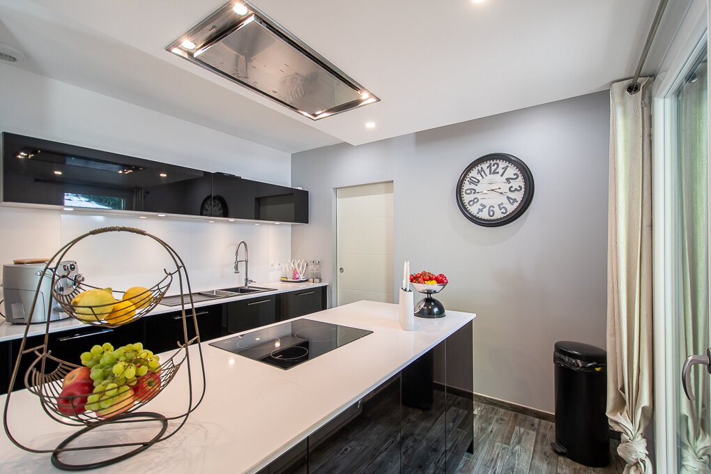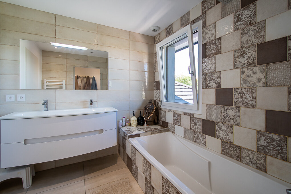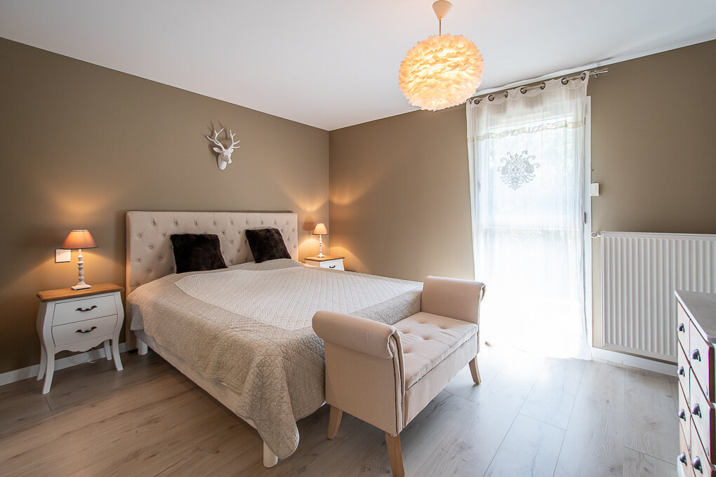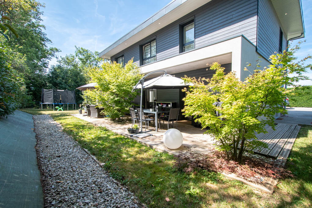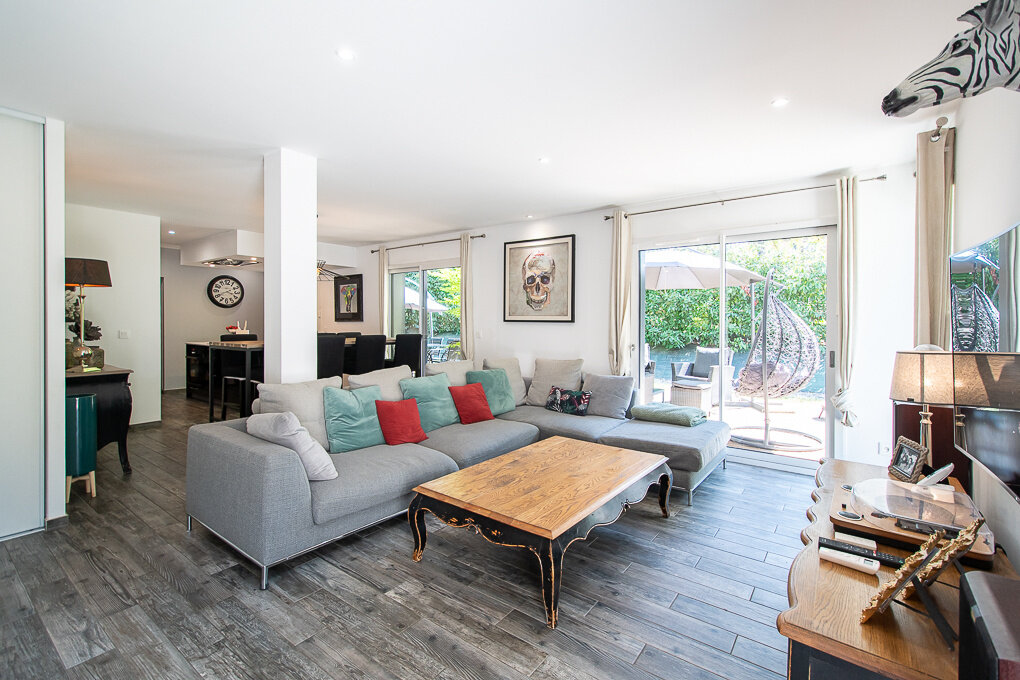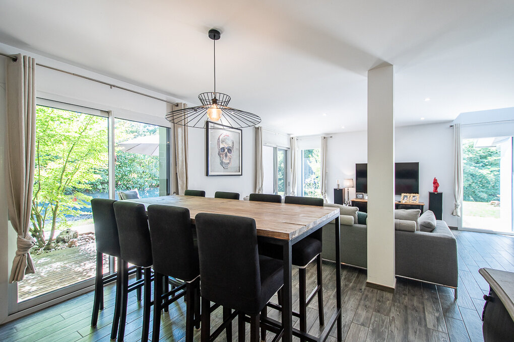 In a quiet and residential area just 10 minutes from the Swiss border and Saint-Julien-en-Genevois, 25 minutes from Geneva and its airport.Modern villa built in 2015 of 184 sqm with high-quality features (reinforced insulation, heat pump) and functional living spaces.It comprises a bright living room with a fully fitted open-plan kitchen with central island and pantry, dining room and lounge with woodstove and terrace/garden accesses. 4 bedrooms including one with ensuite shower room, toilet and outside access. Bathroom. Utility room and plenty of storage space. Games room. Wine cellar. Garage. DPE: A1215 sqm enclosed plot with trees, terrace, carport and parking spaces.Information regarding the risks to which this property is exposed is available on the website georisques.gouv.frAgency fees chargeable to the seller.