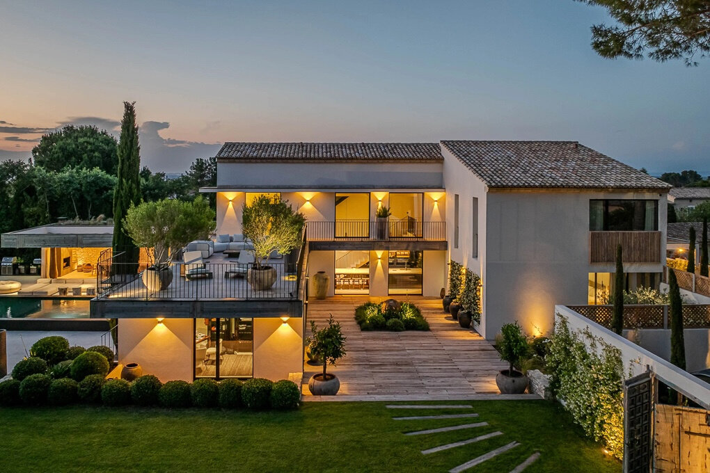 Outside, the 2,000 sqm landscaped garden is a true haven of peace, adorned with cypress trees and century-old olive trees. The heated swimming pool, with its whirlpools, invites relaxation. The 110 sqm pool house, with its bar and stone wall, offers additional living space, including a shower room, toilet, and dressing room.