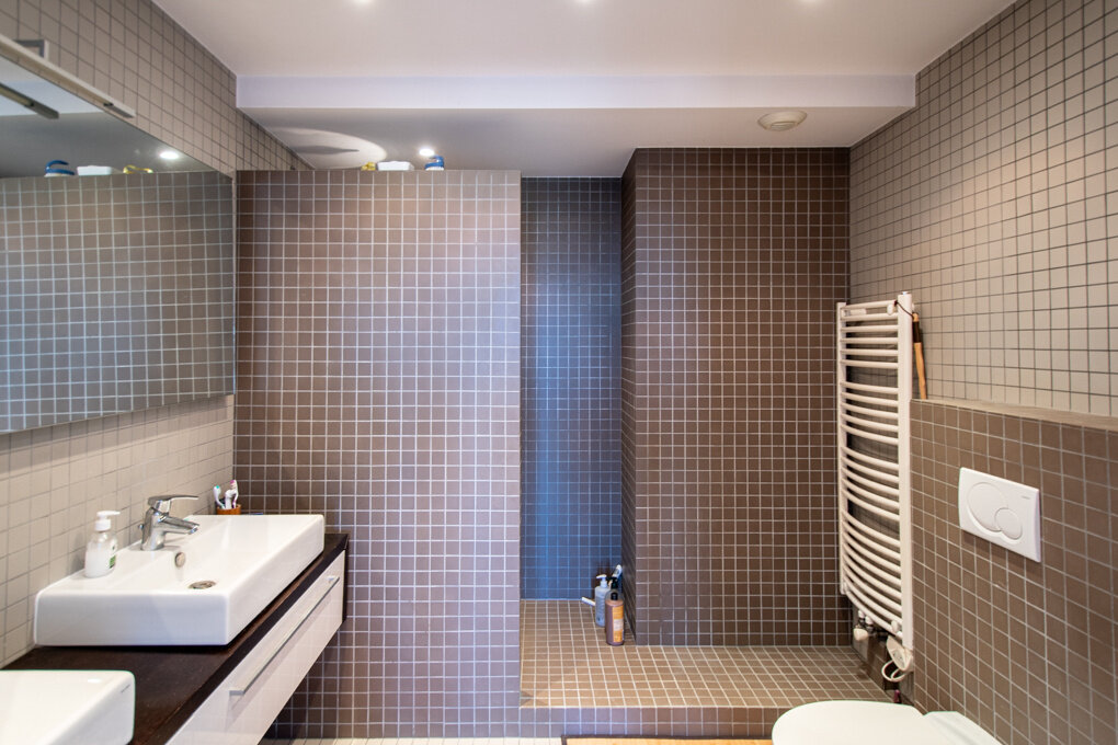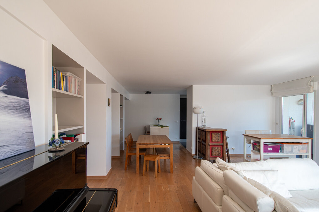 Filled with natural light, the living area comprises an entrance hall with a dressing room and a guest WC, a spacious living/dining room, and a fully equipped separate kitchen, all opening onto a pleasant terrace with open views of the Alps. The night area features a master suite with a private bathroom and direct access to the terrace, two well-proportioned bedrooms, a study that could be opened onto the living room to create a more contemporary layout, as well as a separate bathroom.