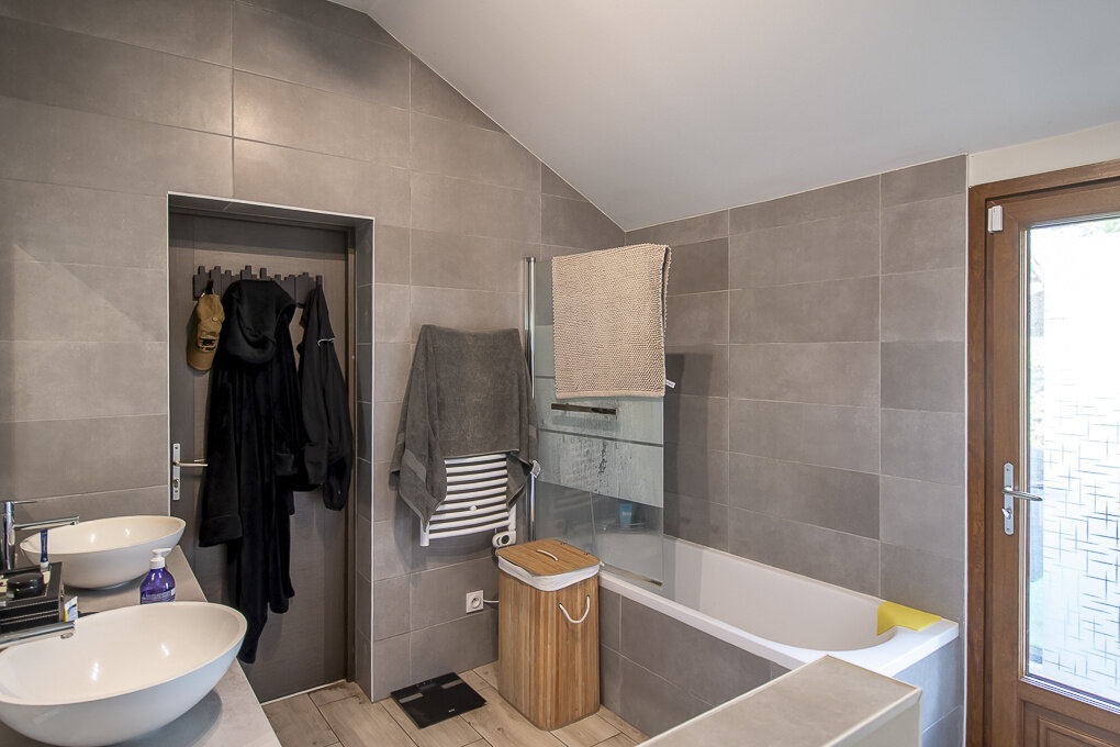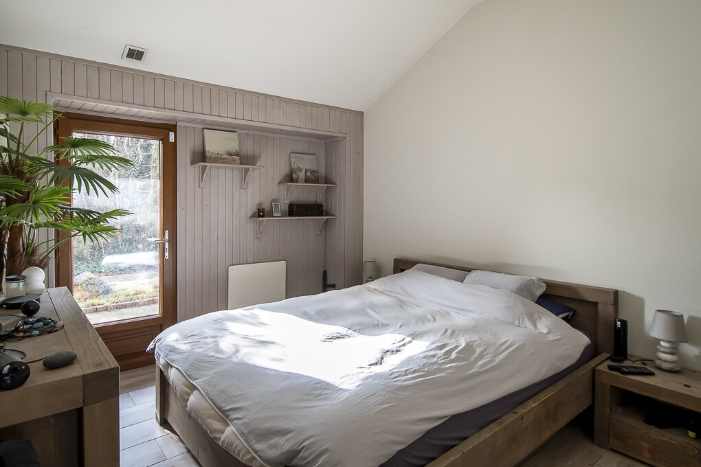 The entrance opens onto a bright living room with a fireplace and direct access to the garden. The property also includes a modern, fully equipped kitchen, a first bedroom that can be used as an office, a second en-suite bedroom with a shower room, as well as a spacious master suite. Additional features include a garage of approximately 46 sqm with a mezzanine offering potential for extension, a carport for two vehicles, a garden shed, two attractive terraces, a jacuzzi, and an above-ground swimming pool.