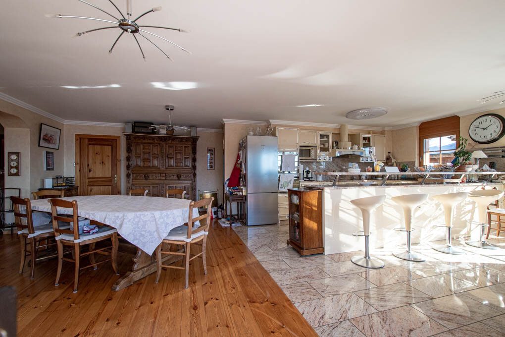 The interior has a spacious living room facing South-West with two-side fireplace, an open-plan equipped kitchen and a dining room. There are 5 bedrooms including a large master suite with private shower room and dressing room. Laundry room and plenty of storage space.