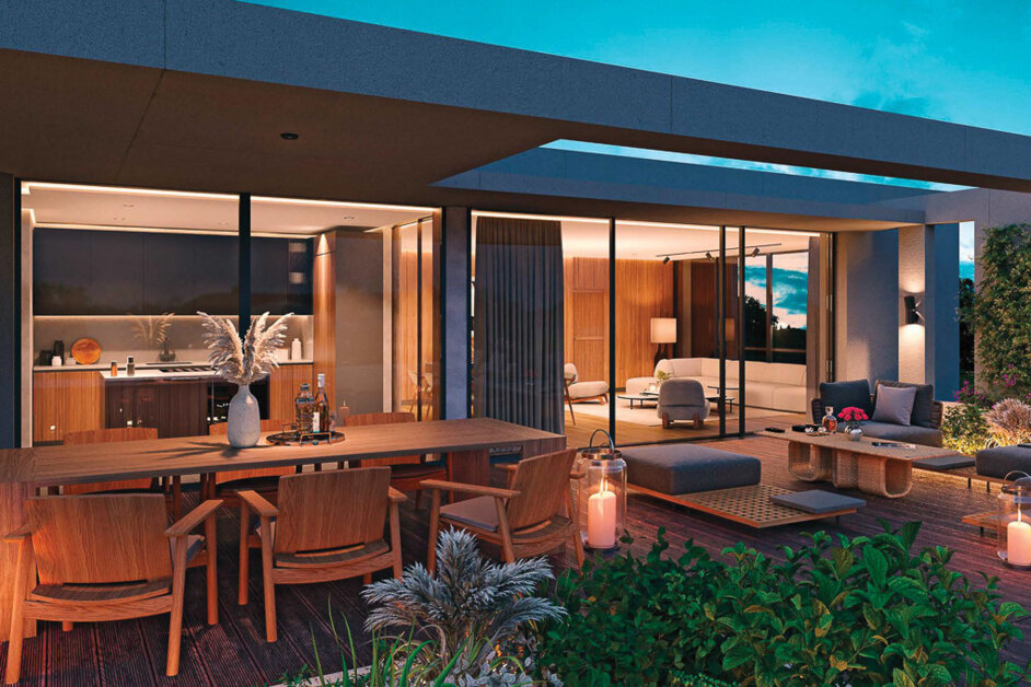 The bright interior spaces feature high-end finishes: BULTHAUP kitchen, RIMADESIO fittings, noble materials, parquet, and natural stone. The 40 sqm living room opens directly onto the terrace, a true extension of nature, while two bedrooms, including a master suite with dressing room, ensure comfort and privacy.