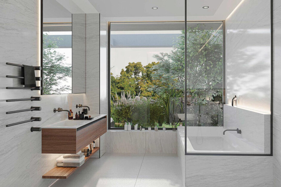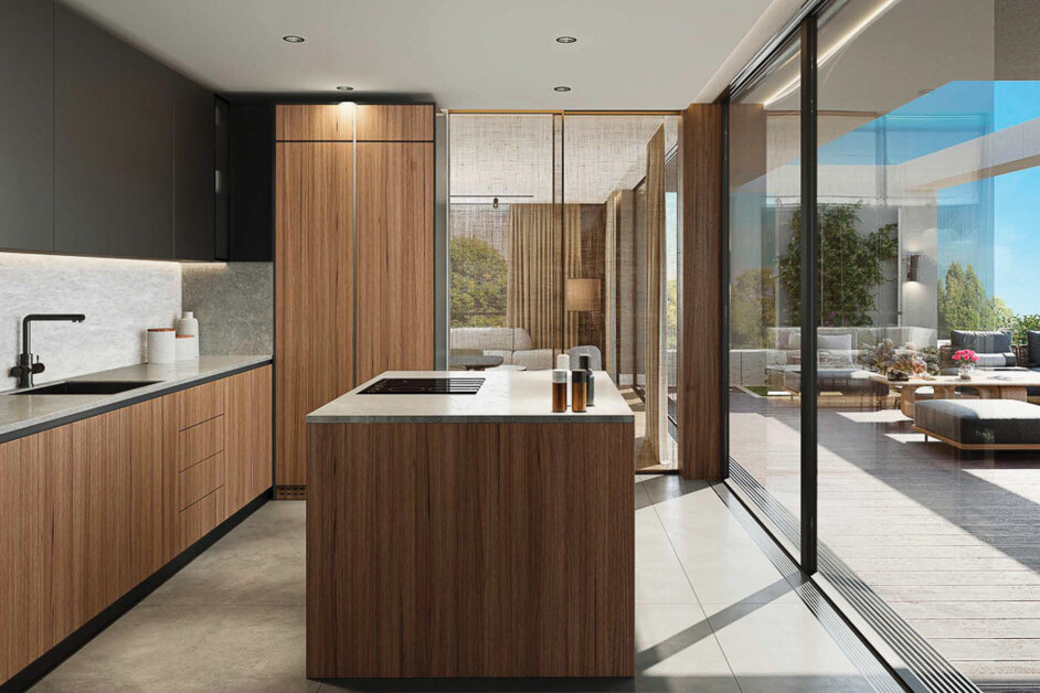 The bright interior spaces feature high-end finishes: BULTHAUP kitchen, RIMADESIO fittings, noble materials, natural wood, and stone flooring. The 44 sqm living room opens directly onto the terrace, a true extension of nature, while three bedrooms, including a master suite with walk-in closet, ensure comfort and privacy on the upper floor.