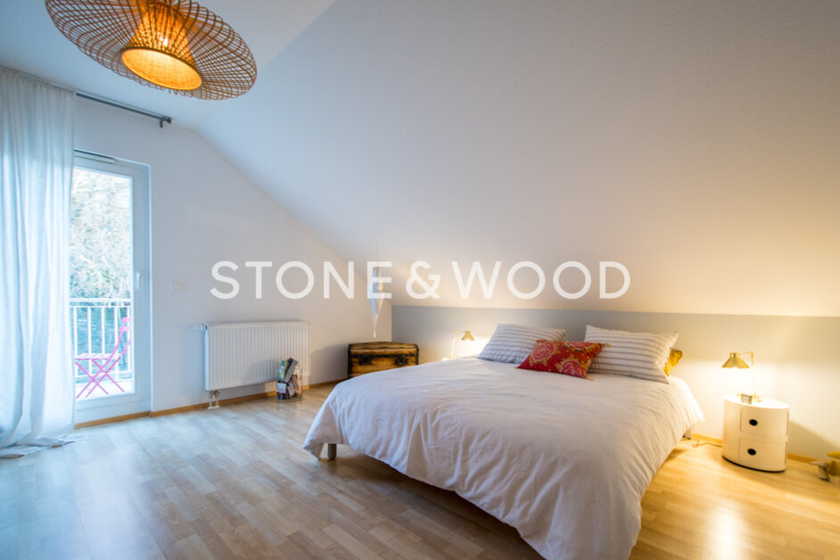 Charmante villa jumelée par le garage à Archamps. Parcelle de 503 m2 arborée et clôturée. Belle exposition. Grande pièce de vie avec plusieurs accès jardin comprenant double salon, salle-à-manger et cuisine équipée. Cheminée possible. 3 grandes chambres. Une salle-de-bains + douche et Wc. Buanderie. Garage. 1 place de parking. Environnement calme et sans vis-à-vis. DPE : C