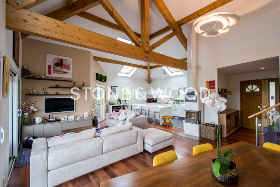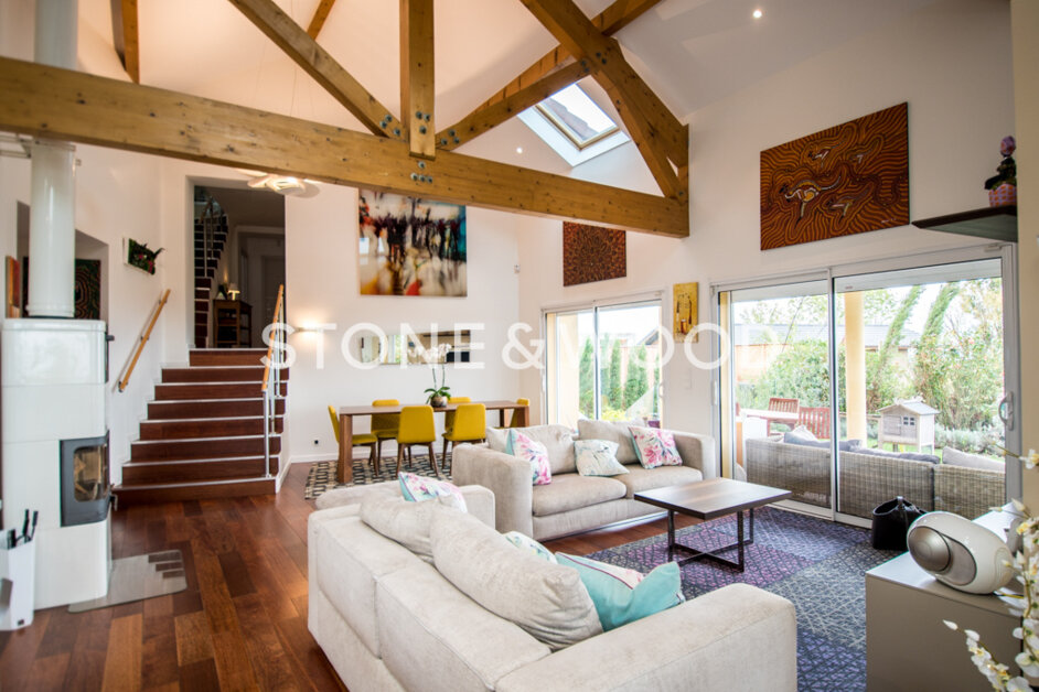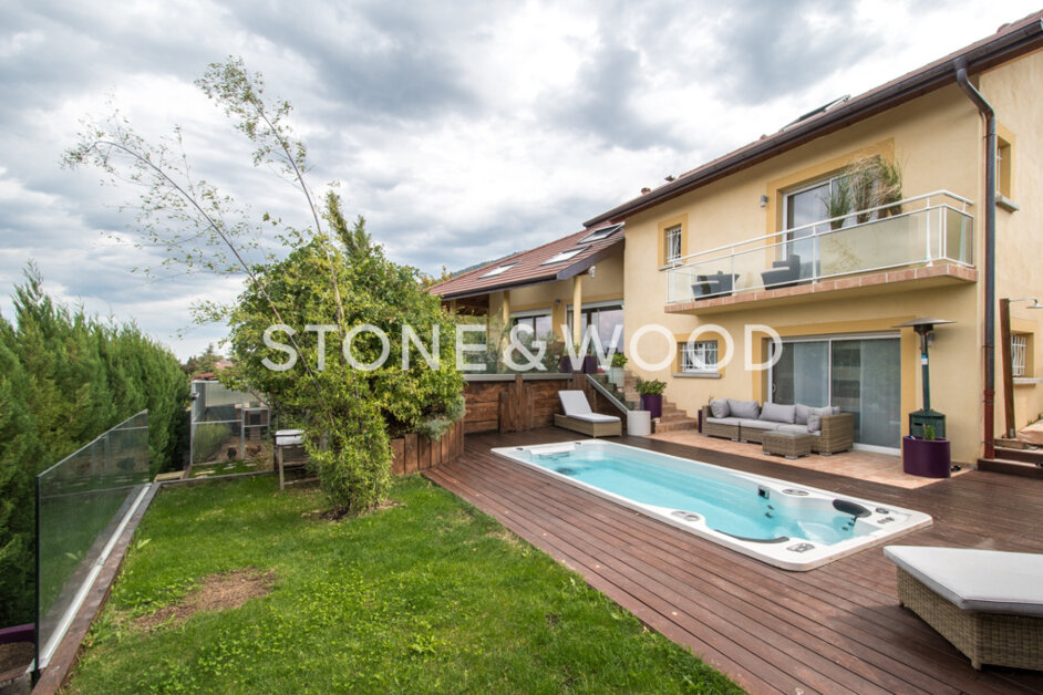Magnifique propriété d'environ 316 m2 utiles établie sur un terrain clos et arboré d'environ 731 m2 sur les hauteurs de Bossey. Cuisine équipée ouverte sur un spacieux séjour/salon avec poêle à bois, salle-à-manger et plusieurs accès terrasse. 5 chambres dont une en-suite avec dressing, salle-de-bains et balcon. Grande mezzanine. 2e salon. Salle de jeux. Buanderie. Caves. Garage et places de parking. Spa de nage. Jardin paysagé. Environnement verdoyant, calme et sans vis-à-vis. A proximité de toutes commodités. Vue dégagée sur Genève et le lac. DPE : D
