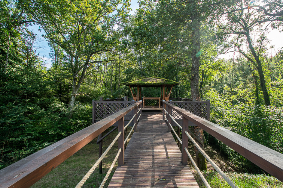 Garage double et places de stationnement. Paillotes de jardin et plateforme dans les arbres.