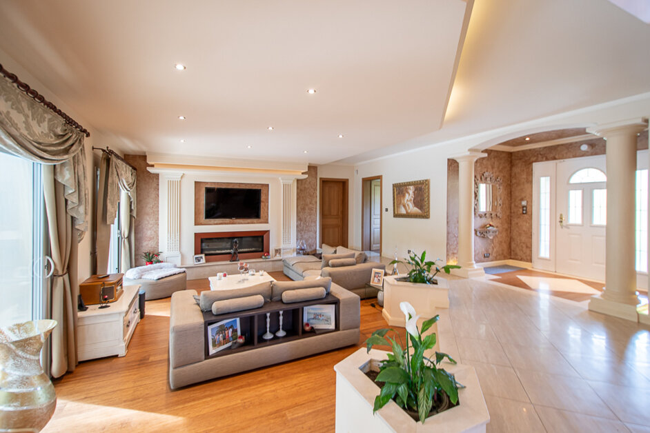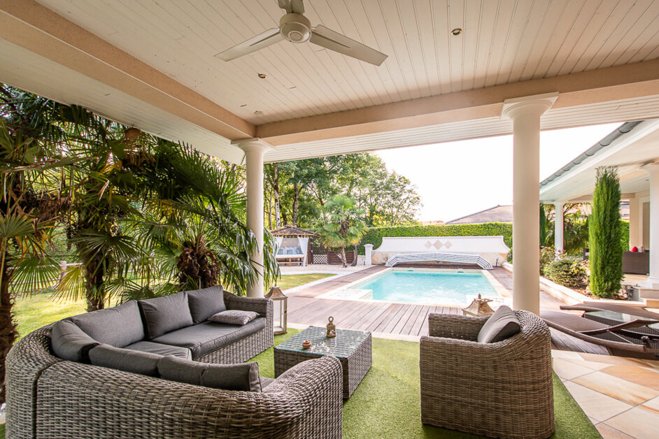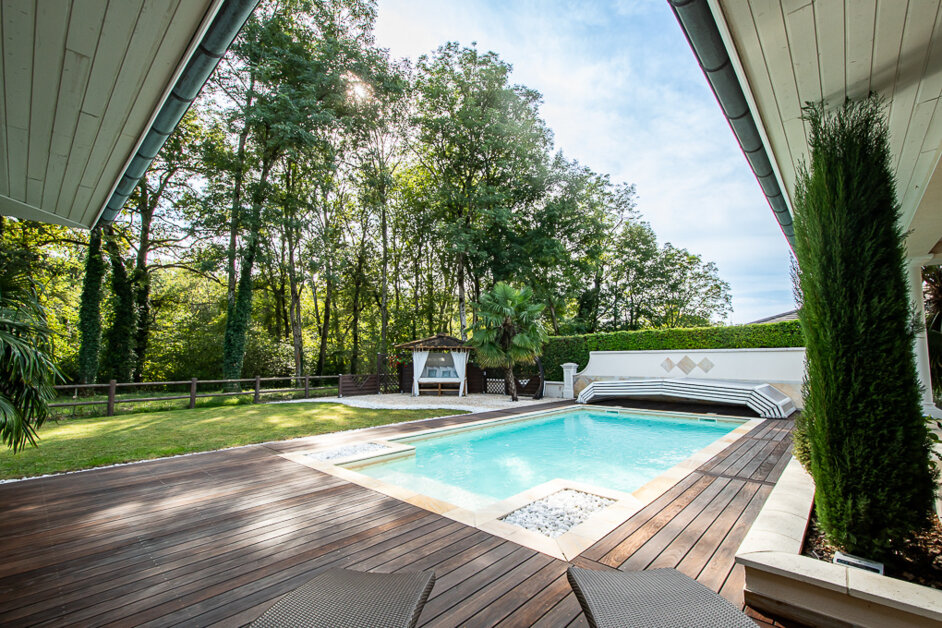 L'intérieur se compose d'un spacieux salon/séjour avec cheminée au gaz, cuisine équipée ouverte et accès à la terrasse couverte et au jardin. Cellier et buanderie. 5 chambres dont 3 en-suite avec leur salle d'eau ainsi qu'une suite parentale au rez-de-chaussée avec dressing, salle-de-bains et WC. Second salon TV à l'étage. DPE : A