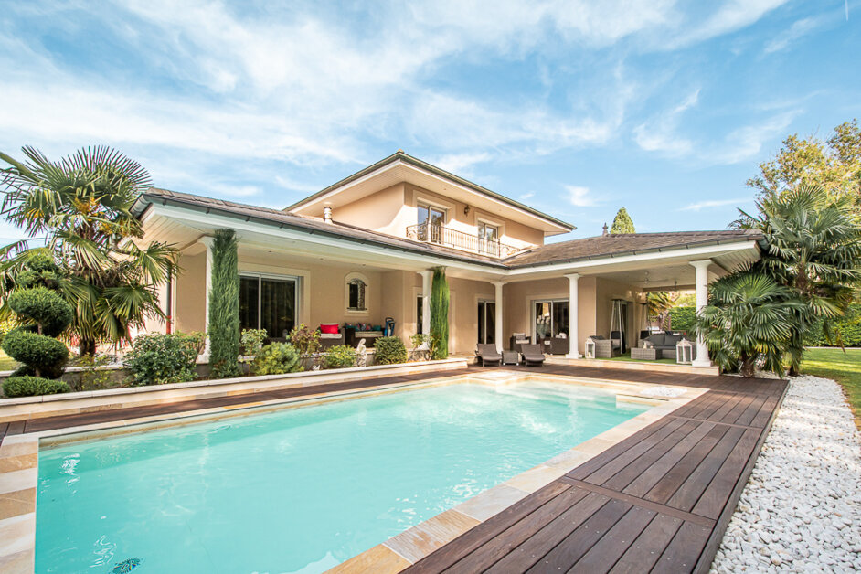 Magnifique villa d'architecte d'env. 274 m2 utiles sur 2 niveaux aux prestations de très belle qualité (chauffage par géothermie, domotique, etc.). Parcelle d'env. 3´739 m2 avec jardin paysager, piscine chauffée et bois privatif donnant sur la Menoge.