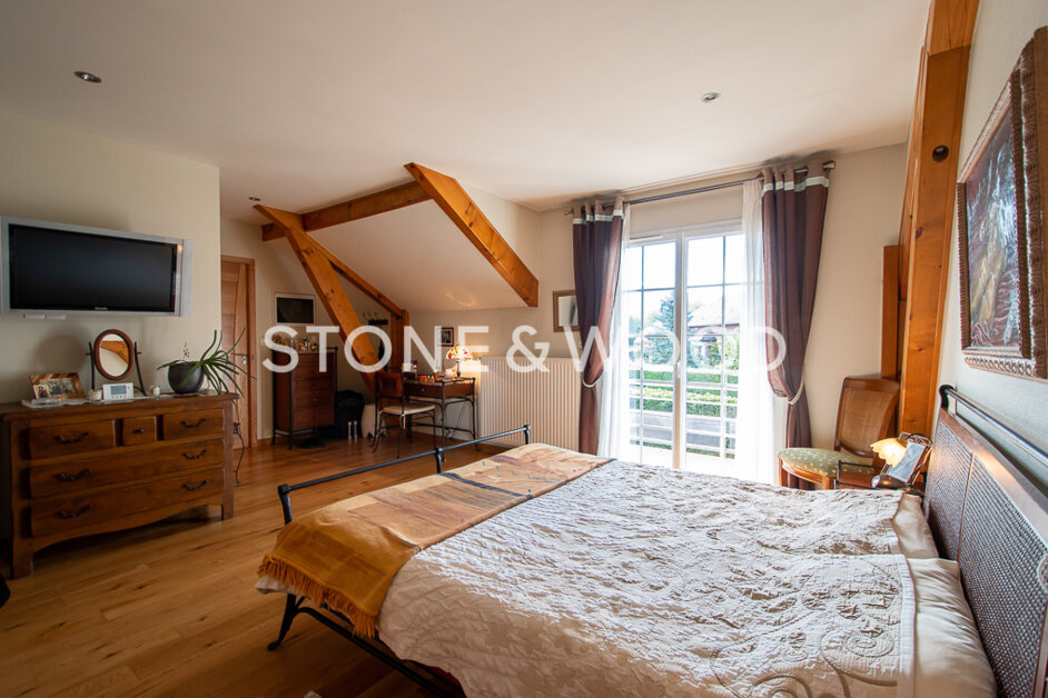Dans un cadre résidentiel et calme à Valleiry, commune frontalière située à 15 min des douanes de Perly et Chancy et à 30 min de Genève. Cette charmante propriété saura parfaitement répondre aux exigences d'une famille tant par sa proximité avec toutes les commodités (commerces, écoles, bus scolaire, activités, accès rapide au P+R, etc.) que sur l'aménagement des pièces qu'elle dispose. Construite en 2009, la maison est lumineuse et offre une surface d'env. 274 m2 utiles (213 m2 habitables) sur 3 niveaux. Parcelle close et arborée de 987 m2 piscinable. L'intérieur se compose d'une grande pièce de vie avec cuisine entièrement équipée avec cellier, salle à manger et salon TV avec cheminée à gaz. Plusieurs accès terrasse. 5 chambres dont une au rez-de-chaussée ainsi qu'une suite parentale à l'étage avec poêle à bois, dressing, salle-de-bains, sauna et balcon. 2 salles-de-bains complètes. Rez inférieur avec atelier, garage et buanderie. Nombreuses places de parking extérieures. DPE : C Honoraires TTC à la charge du vendeur
