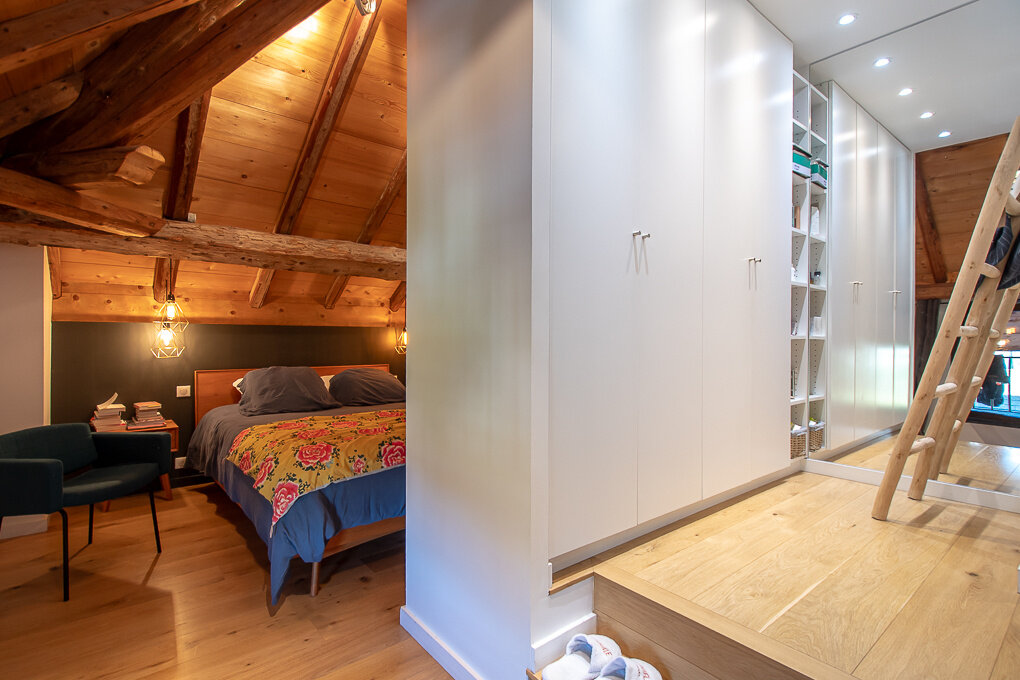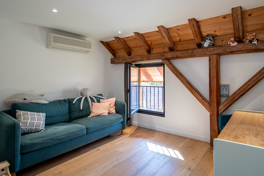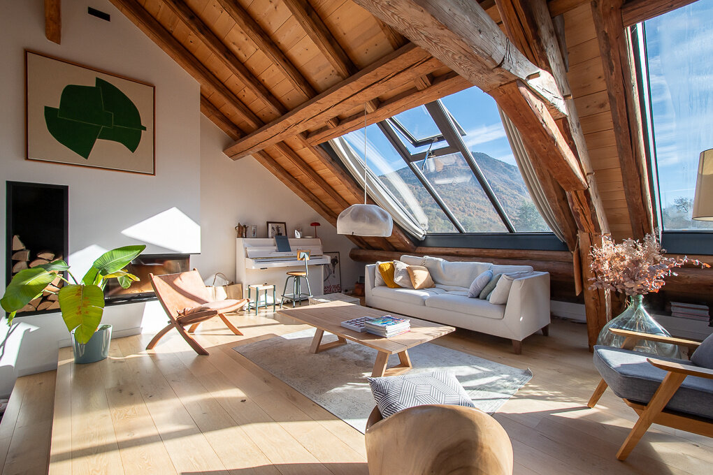 Ses beaux volumes, sa hauteur sous plafond cathédrale et ses larges baies vitrées de type verrière offrent une atmosphère chaleureuse et une magnifique vue dégagée, du Mont Veyrier jusqu’au lac d’Annecy.