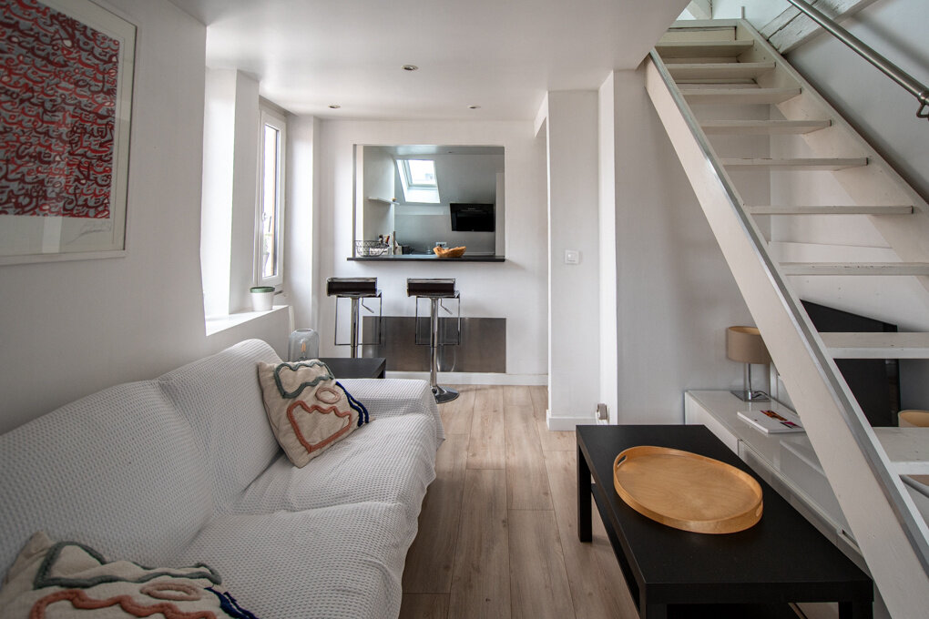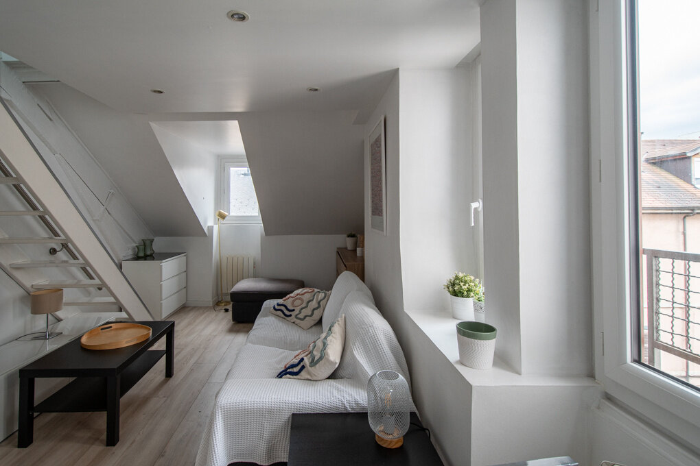 Niché au cœur d'Annecy, au troisième et dernier étage d'un immeuble rénové, ce mini loft lumineux de 32 m2 se compose d'un salon traversant, d'une cuisine ouverte équipée et d'une chambre en mezzanine sous les toits. Parfaitement agencé pour un couple ou une personne seule, il offre un cadre cosy et pratique au quotidien.