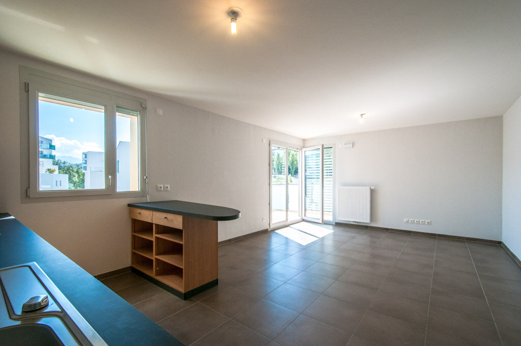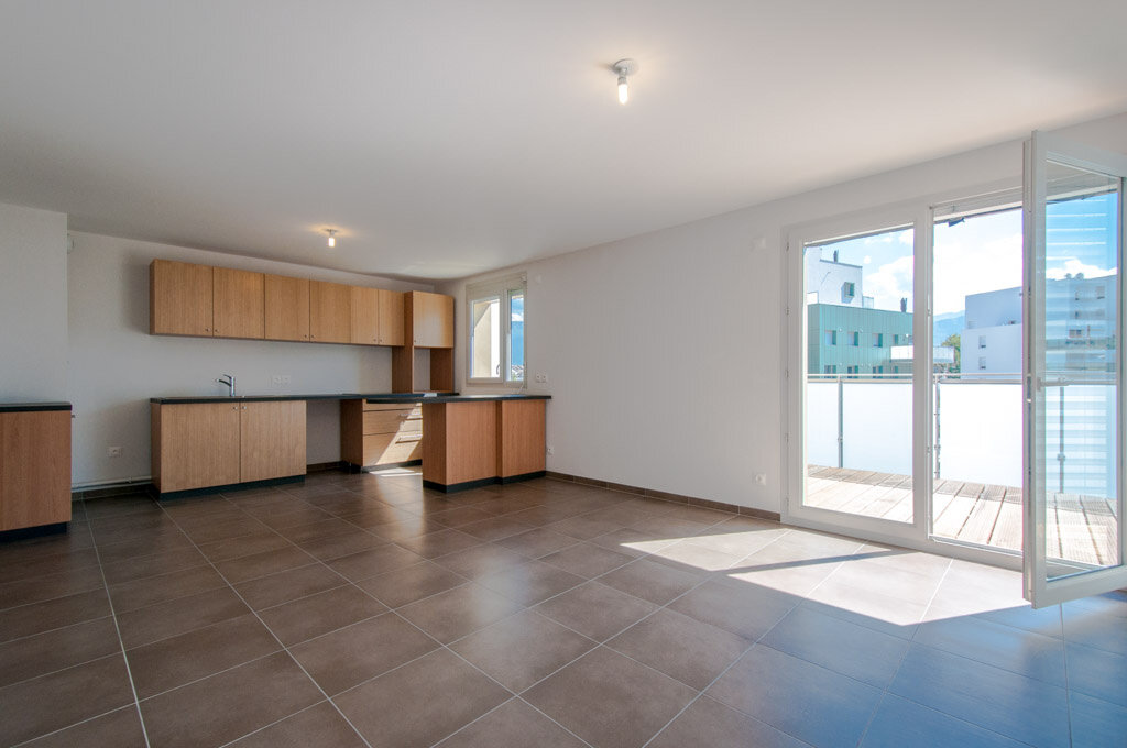 Appartement T4 d'environ 80 m2. Cuisine équipée ouverte sur salon. Terrasse d'environ 15 m2. 3 chambres. 1 salle-de-bains. Cellier. Chauffage granule à bois. Grand garage. Garage à vélo.