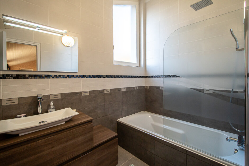 Elle se compose d'une belle entrée avec double séjour, cuisine et véranda. De 4 chambres dont une belle suite parentale de pain-pied. 3 salles-de-bains. Une mezzanine/salle de jeux. Une grande pièce avec accès terrasse offrant plusieurs possibilités d'aménagement (salle de sport, salle de cinéma, cuisine d'été, appartement séparé, etc.)