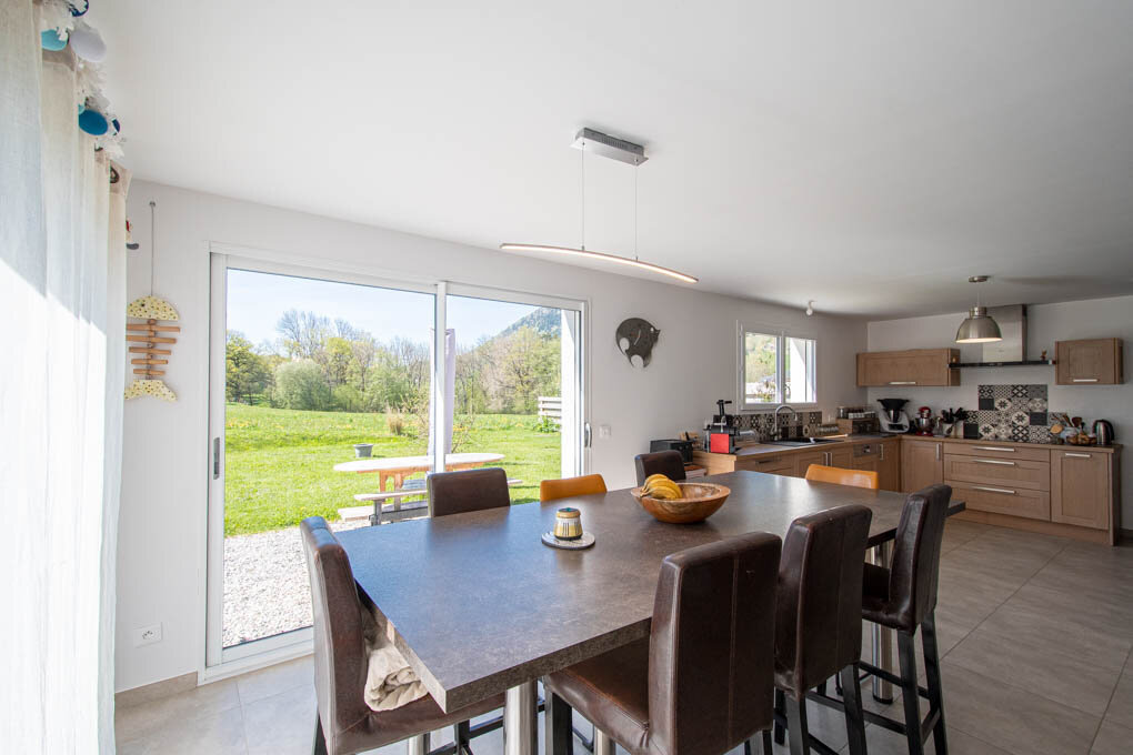 Dans un cadre privilégié, calme et verdoyant, à 20 min d'Annecy et des stations de ski, à 10 min du lac. Construite en 2017 (RT2012), villa moderne jumelée par le garage d'une surface de 106 m2 hab. sur 2 niveaux. Parcelle de 558 m2 sans vis-à-vis avec magnifique vue sur les dents de Lanfon. Les prestations sont soignées et offrent un intérieur moderne et lumineux tourné vers la nature. La villa se compose d'une grande pièce de vie comprenant séjour avec accès jardin et cuisine ouverte équipée. À l'étage 3 belles chambres avec dressing. Grande salle de douche avec double vasque et douche italienne. En annexe, garage de 18 m2 avec mezzanine, et buanderie/local technique (chauffage par pompe à chaleur). DPE : B Honoraires TTC à la charge du vendeur