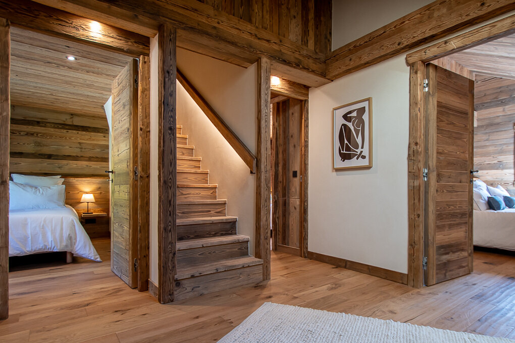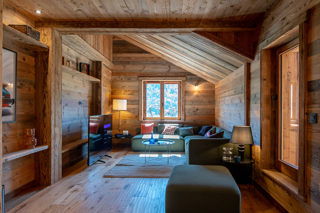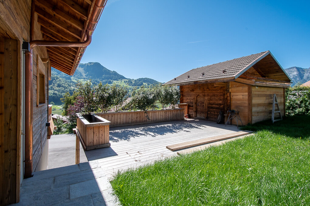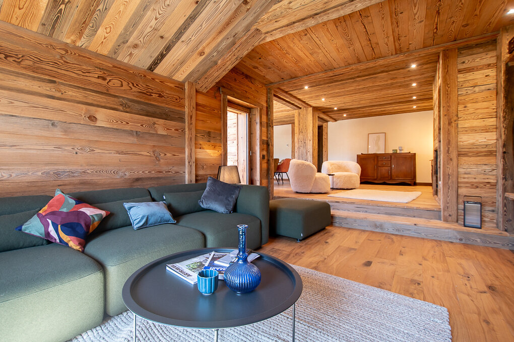 La partie proposée ici développe 220 m2 habitables avec un mazot indépendant. Elle comprend un spacieux salon/séjour avec cheminée et grande terrasse, une cuisine équipée ouverte, 5 chambres en-suite dont un dortoir. Rez de jardin avec ski-room/local à vélos/cave à vin, garage de 51 m2 avec alimentation pour une borne de recharge, et espace bien-être avec jacuzzi, sauna et douche.