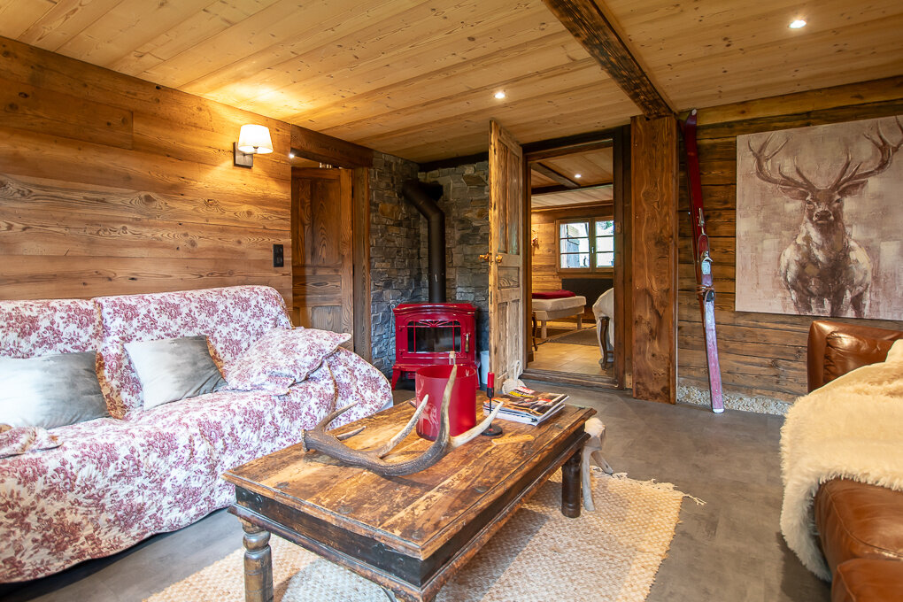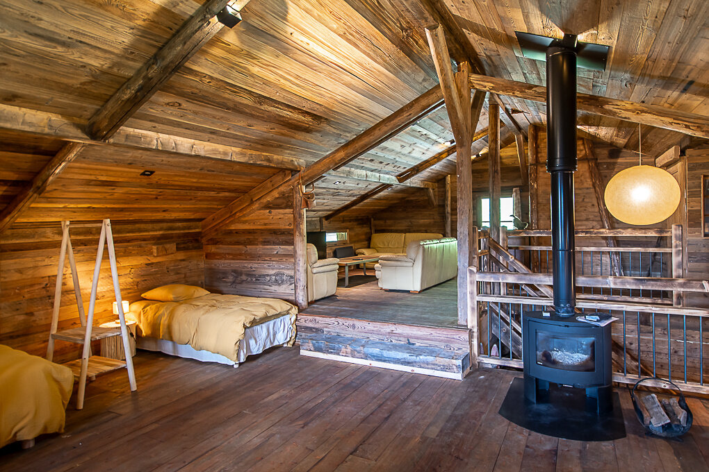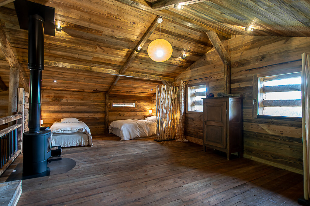 À l’étage, une vaste pièce sous charpente apparente, modulable en dortoir ou en salon, s’articule autour d’un poêle. Un espace est prévu pour une future salle de bains ainsi qu’un WC indépendant.