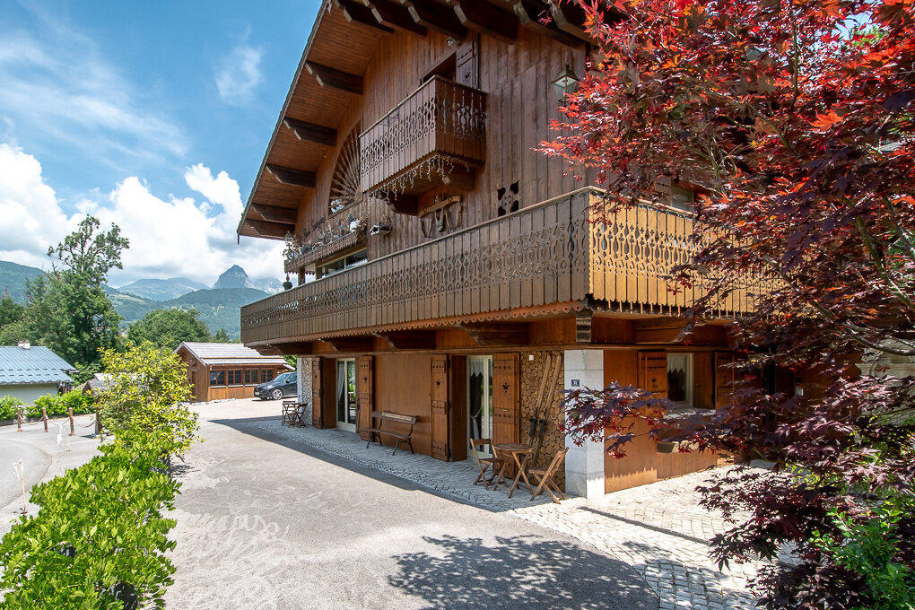 Édifié sur une parcelle de 1 275 m2 en bord de rivière, il se compose de 7 appartements indépendants, répartis sur trois niveaux, avec plusieurs espaces terrasse, un grand parking pouvant accueillir une dizaine de véhicules, et de nombreuses annexes : carnotzet de 20 m2, abri voiture, local à ski, atelier et local technique.