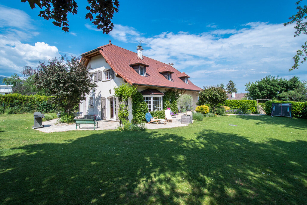Charme et authenticité pour cette propriété de 250 m2 habitables mélangeant le moderne et l'ancien. La maison possède également un grand garage double, l'ensemble implanté sur une belle parcelle de 1'084 m2. Les finitions de bonnes qualités et les espaces vous séduiront. Cuisine équipée indépendante avec accès terrasse, grand séjour avec cheminée donnant sur le jardin. 2e salon. Bibliothèque. 5 chambres dont une grande suite parentale avec dressing et salle d'eau. Grand sous-sol complet comprenant notamment une cave-à-vin et une salle-de-jeux avec cuisine équipée. Cadre calme et résidentiel. Golf de Maison-Blanche à 2 km, aéroport de Genève à 15 minutes, Centre commercial à 5 kms. DPE : D