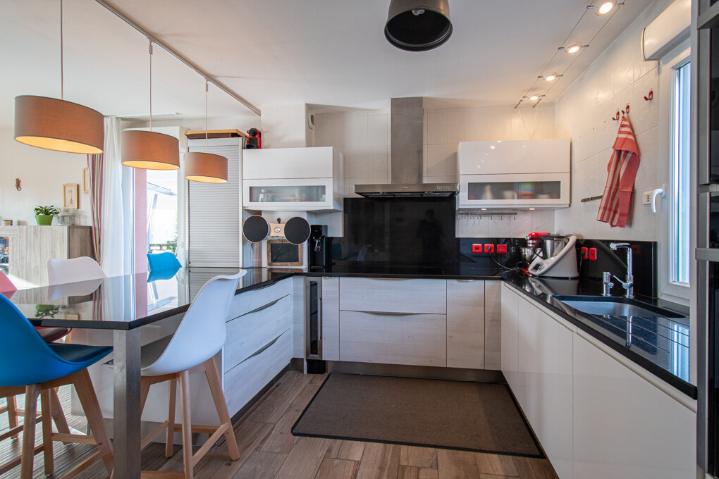 Charmante propriété moderne mitoyenne par le garage d'environ 120 m2 construite en 2005 située dans un quartier résidentiel proche de toutes commodités (100 m transports en commun, 3 min école / crèche). Parcelle close et arborée d'environ 480 m2.